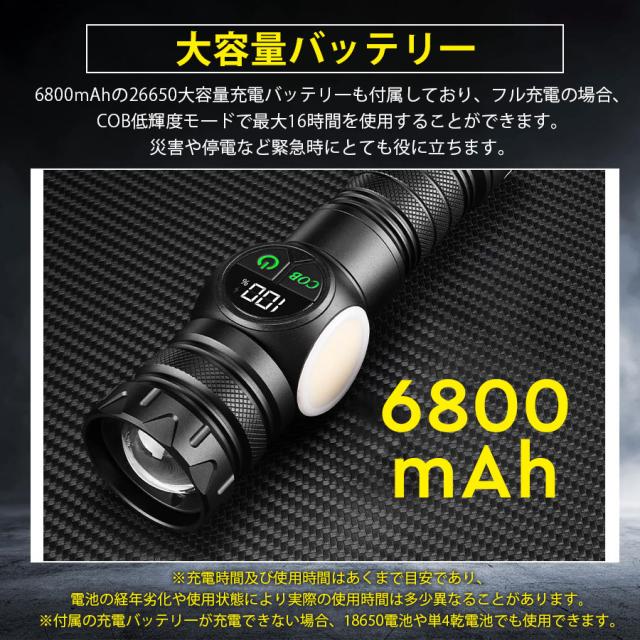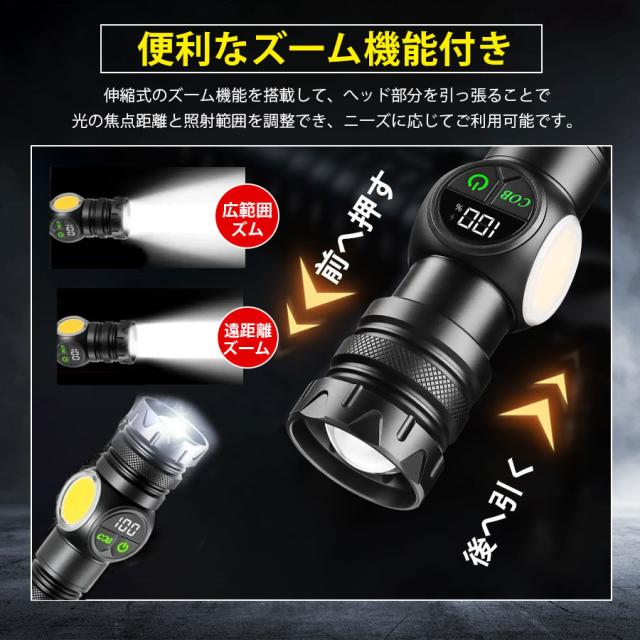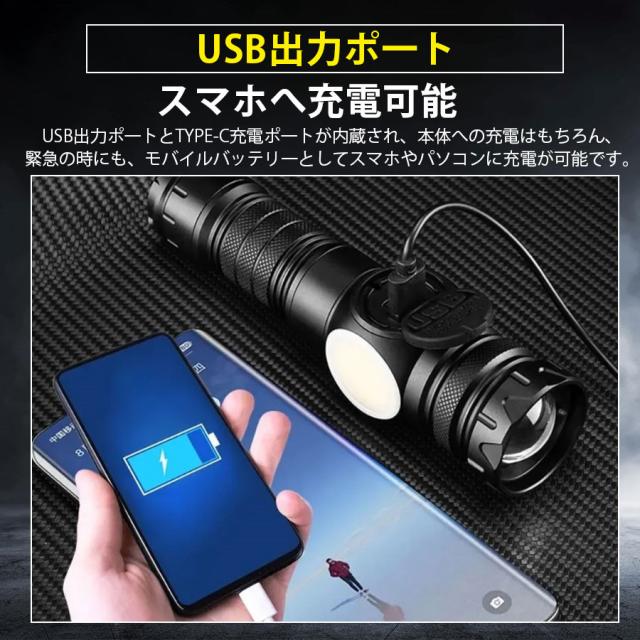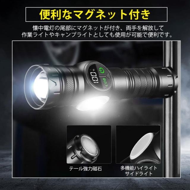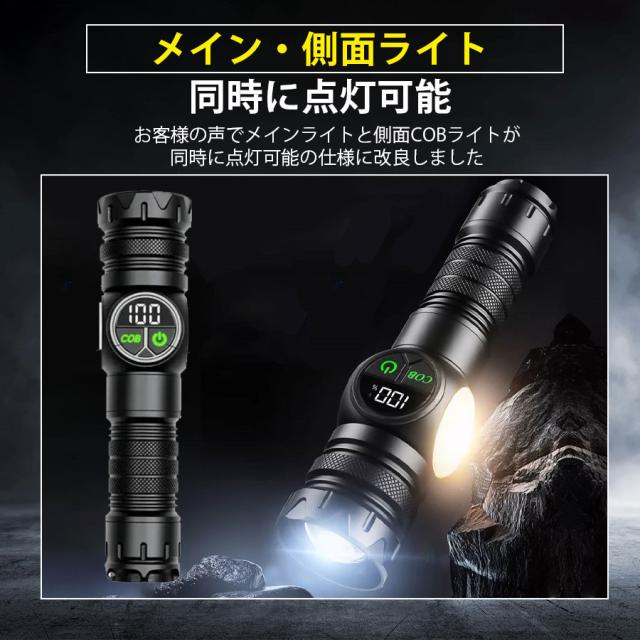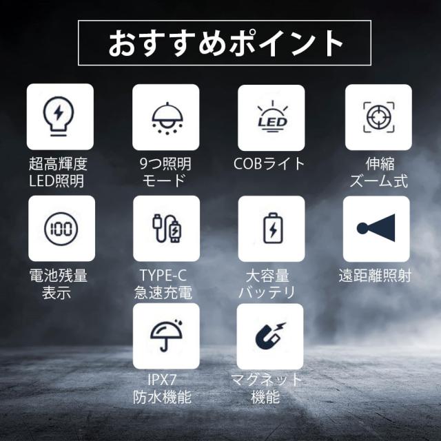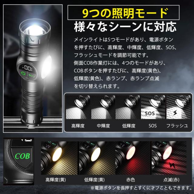 最新型の充電式懐中電灯、強力で高輝度のLED電球、5つのメインライトと4つのCOB(サイドライト)モード、全部9つの点灯モード、メインライトと側面ライトを同時に点灯可能、後部に強力なマグネット搭載、USB充電式(Type-C充電ポート)、伸縮ズーム搭載、IPX6防水仕様。