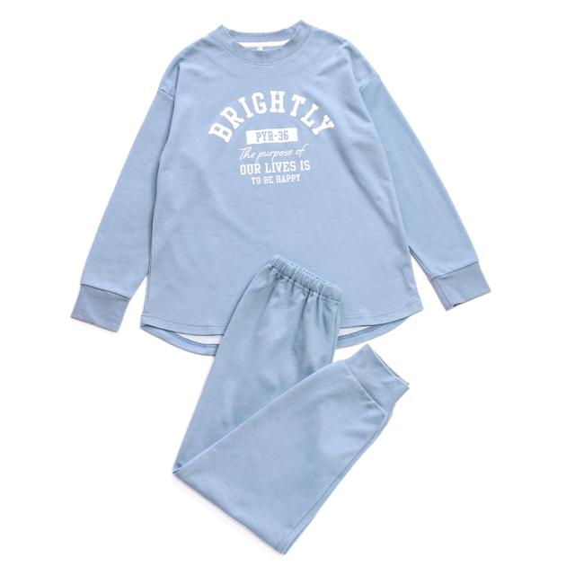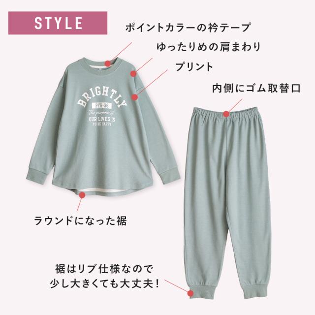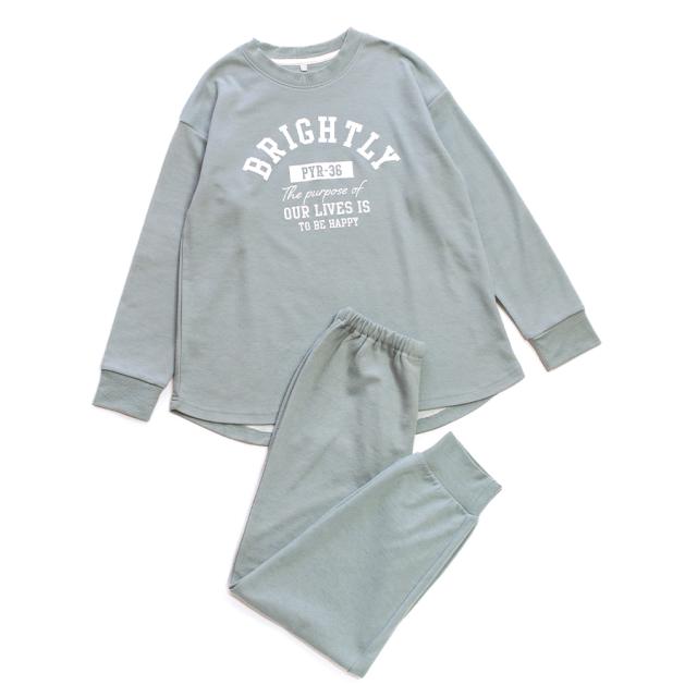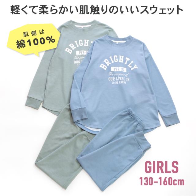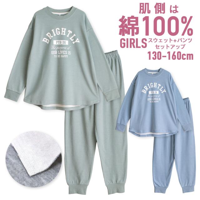 パジャマ キッズ 女の子 内側が綿100% 長袖 春 秋向き スウェット上下 リブ仕様 ニュアンスカラー ロゴプリント ラウンドヘム アッシュブルー グリーン 130 140 150 160 子供 ガールズ ジュニア かわいい