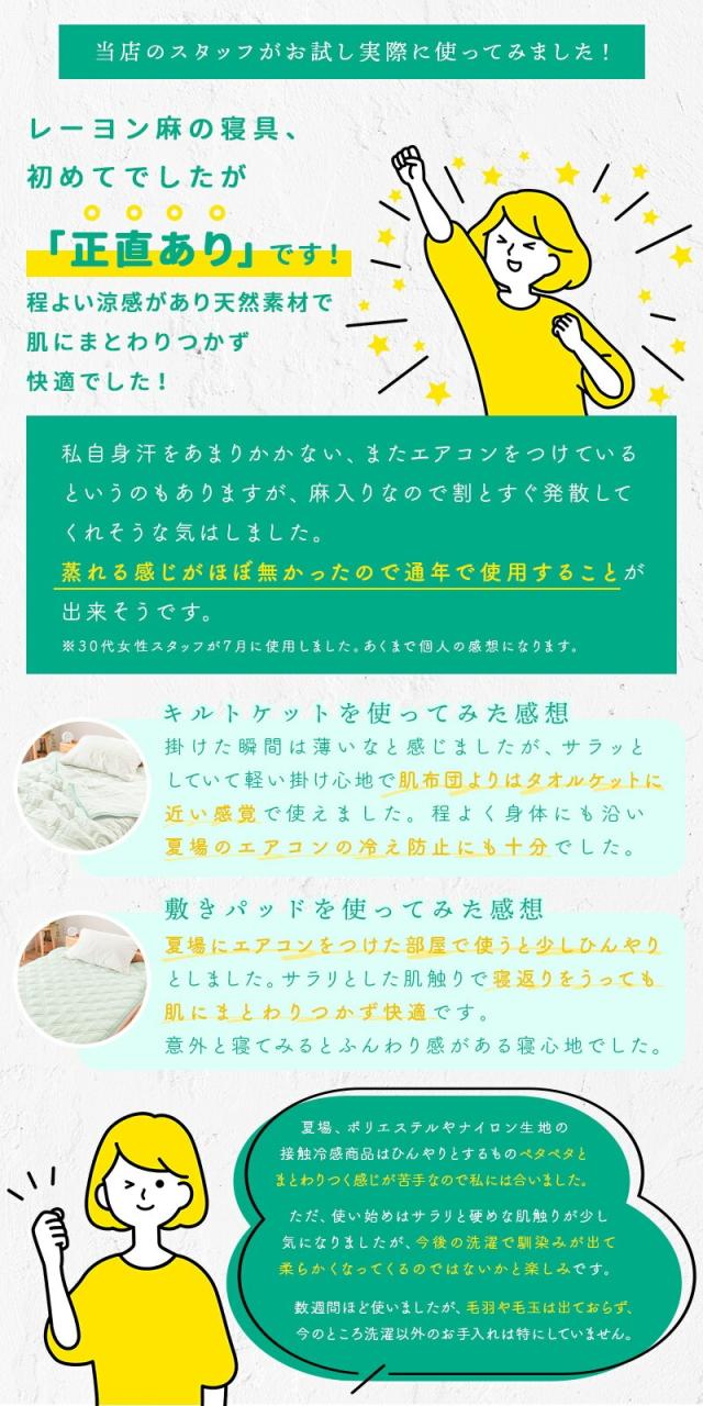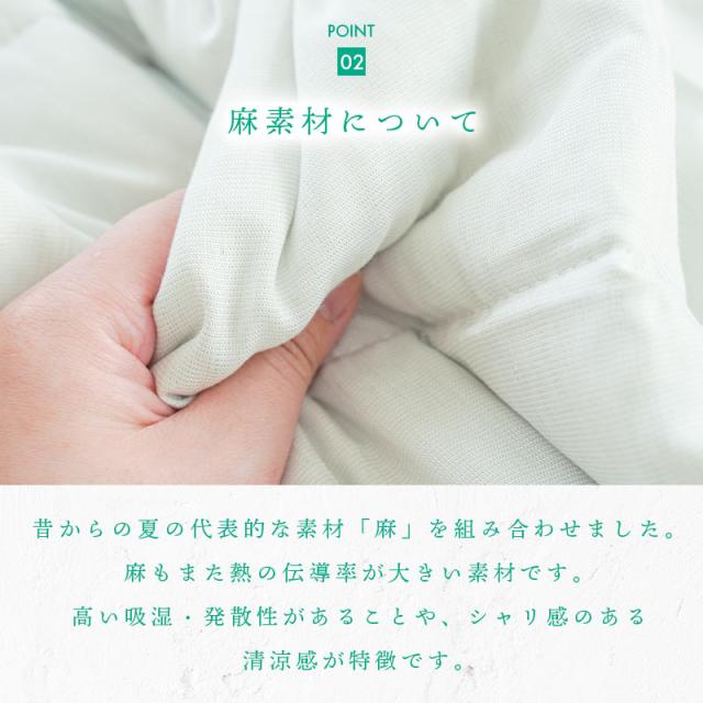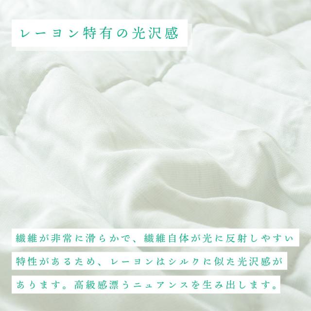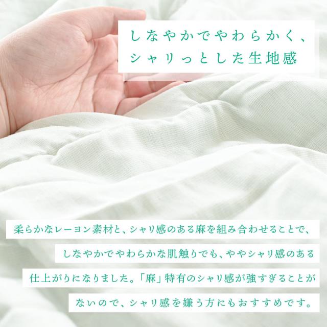 ・レーヨン素材について レーヨンは植物由来の植物です。柔らかなやさしい肌触りや優れた通気性や吸湿性、なめらかなしなやかさなどの特徴があります。繊維として熱の伝導率が大きい素材なので綿素材よりひんやりする感覚があります。 ・レーヨン特有の光沢感繊維が非常に滑らかで、繊維自体が光に反射しやすい特性があるため、レーヨンはシルクに似た光沢感があります。高級感漂うニュアンスを生み出します。 ・麻素材について昔からの夏の代表的な素材「麻」を組み合わせました。麻もまた熱の伝導率が大きい素材です。高い吸湿・発散性があることや、シャリ感のある清涼感が特徴です。 ・しなやかでやわらかく、シャリっとした生地感柔らかなレーヨン素材と、シャリ感のある麻を組み合わせることで、しなやかでやわらかな肌触りでも、ややシャリ感のある仕上がりになりました。「麻」特有のシャリ感が強すぎることがないので、シャリ感を嫌う方にもおすすめです。 ・ロングシーズン使える触れた時に少し「ひんやり」と涼感のあるレーヨン麻は、晩春から夏、初秋までロングシーズン使えます。暖かい時期の使用におすすめです。 ・西川株式会社×こだわり安眠館オリジナル商品品質にこだわりたいという方も安心。当店と日本有数の寝具メーカー「西川」が共同開発したオリジナルの商品です。 ・洗濯機で丸洗いOK!じゃぶじゃぶ洗えていつも清潔直接お肌に触れるものだから「洗える」を条件に選びたい。洗濯機で丸洗いOKなので、汚れても気軽にご自宅でお洗濯できいつでも清潔にお使いいただけます。 |
