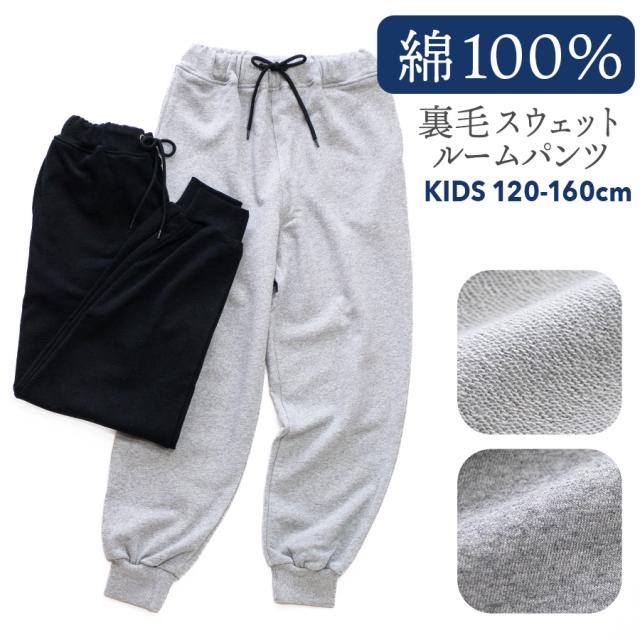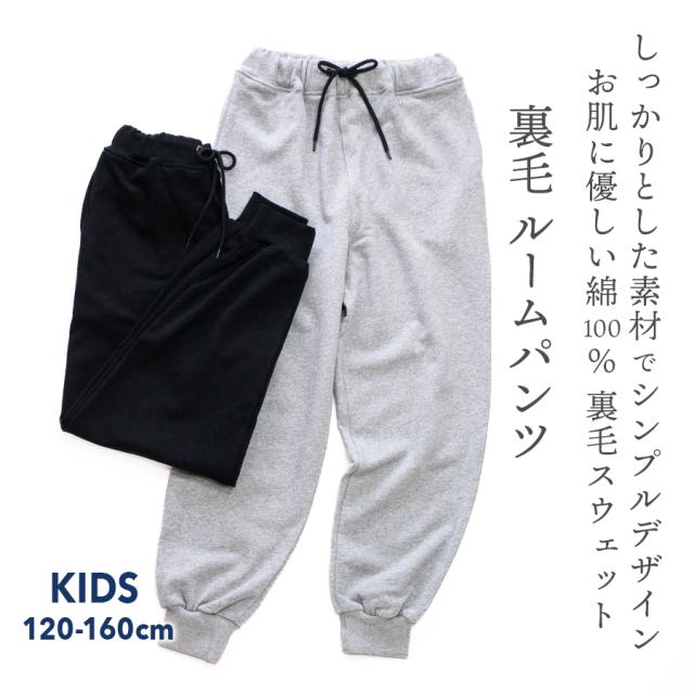 ルームパンツ キッズ 男の子 女の子 パジャマ 綿100% パンツ リブ付き 秋 冬 重厚感のある裏毛 スウェット ブラック グレー 120 130 140 150 160 ワンマイルウェア ユニセックス 親子 おそろい リンクコーデ プレゼント