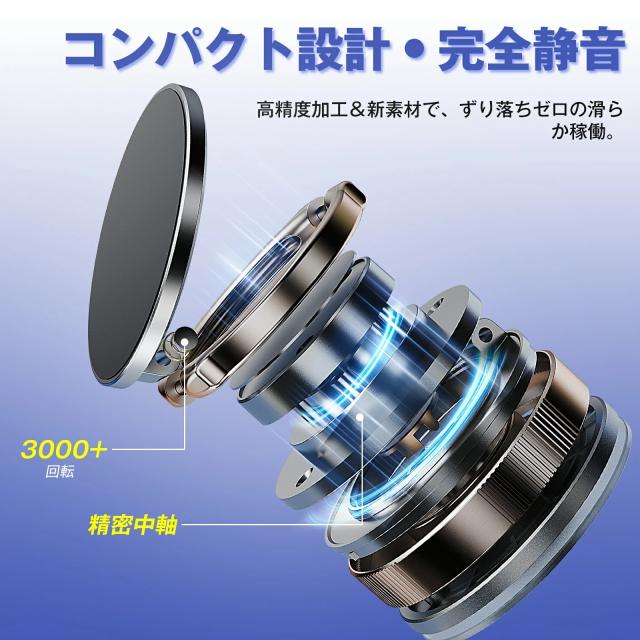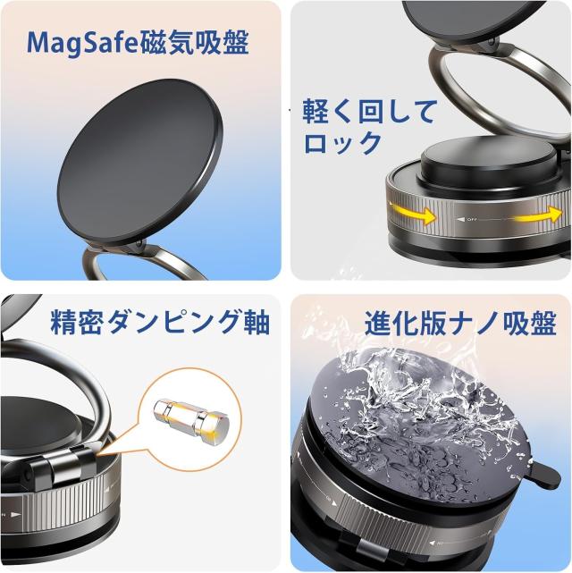ワンタッチで吸着・着脱。 24個のN55ネオジム磁石を内蔵し、MagSafe対応iPhone12シリーズ以降だけでなく、MagSafe非対応iPhoneでもそのまま吸着可能。その他スマホに付属の磁気リングを貼るだけで片手で瞬時に着脱。運転・旅行・ドライブにも最適なスマホスタンドです。