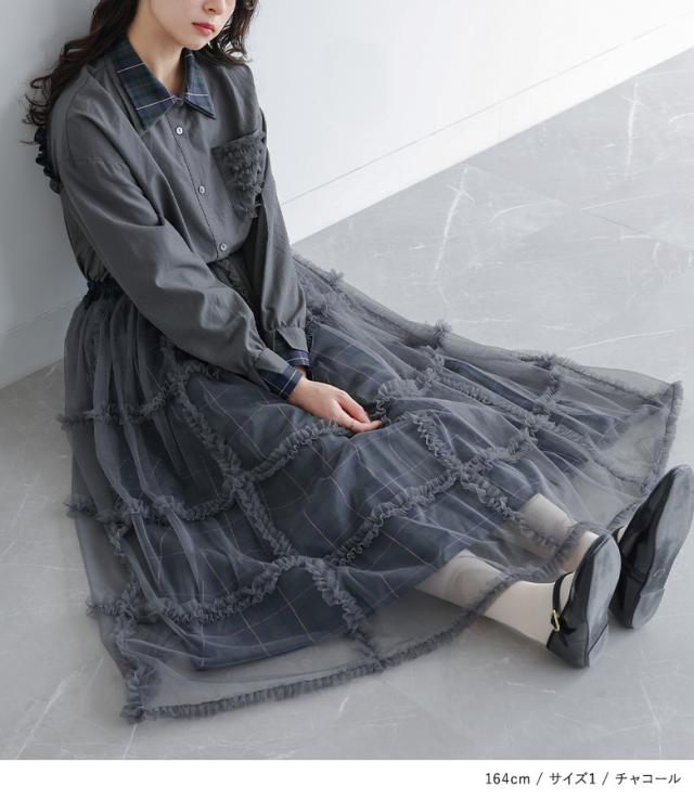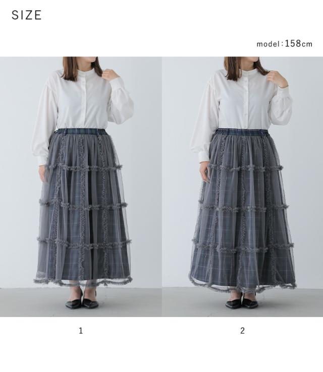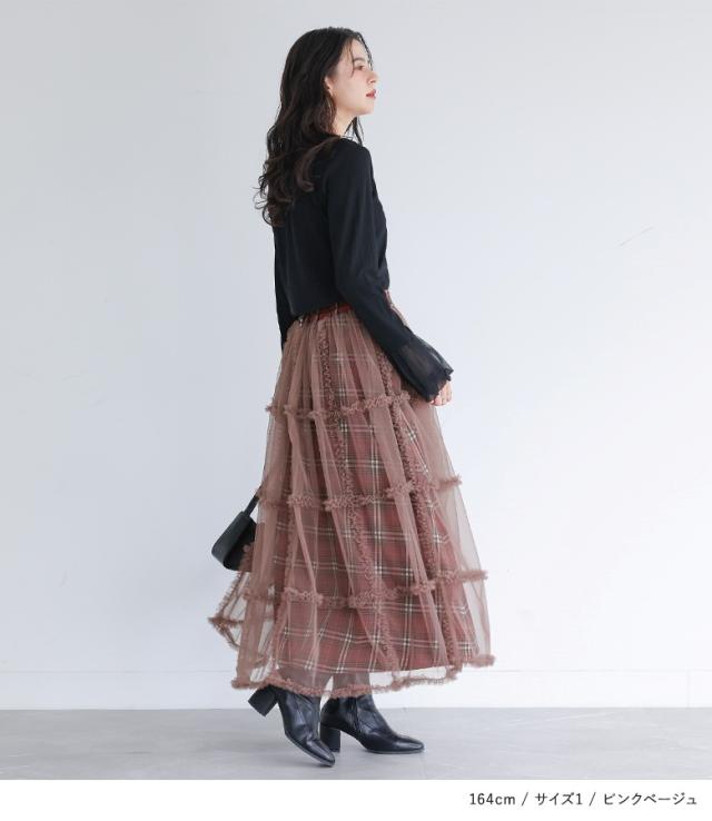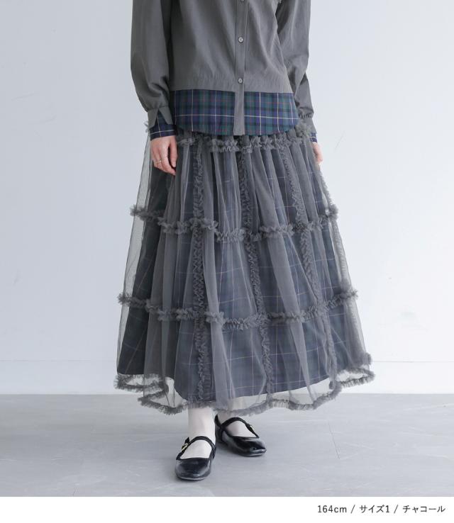 <冬新作>『シアーチェックフリルスカート』【メール便不可】【30】[フリルスカート ロング丈 レディース ボトムス セットアップ対応 チュール チェック柄 シアー レイヤード 春 秋]
