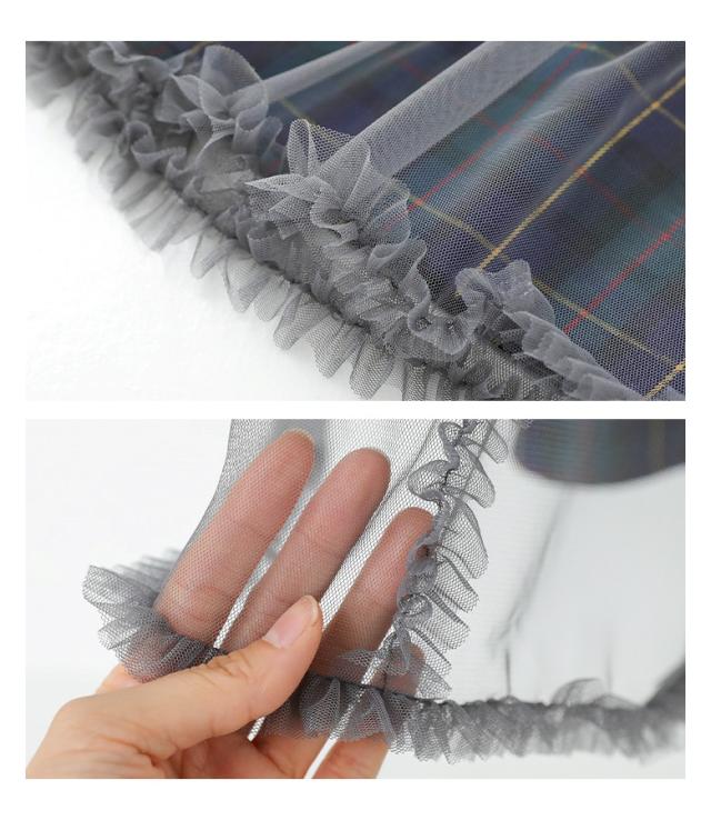■デザイン チェック柄の上にチュールを重ねたレイヤードスカート。チュール生地をベースに、細いフリルのチュールをチェック柄のように縫い付けることで、立体感のあるチェック柄を表現。ウエスト下にたっぷりギャザーを入れて、裾に向かって広がるフレアスカートのシルエットを作り出したコーディネートの主役になる華やかなスカートです。ウエスト後ろはゴム入りのため、楽に着用できるのも嬉しいポイント。 ■コーディネート 無地のシンプルなトップスが主役のスカートを引き立ててくれます。襟付きのトップスと合わせると、レトロ感のあるどこか懐かしいスタイリングに。ローファーやパンプスで上品さをプラス。 ■素材 外側の生地には透け感のある柔らかなチュール生地を使用。チェック柄のように縫い付けた細いフリルで、立体感のある表情と中側のチェック柄との重なりを楽しめます。中側の生地は配色感が大人可愛いチェック柄の生地。インナーが透けにくく安心してご着用いただけます。カラーごとに柄のテイストも変えたこだわりの一枚です。 |