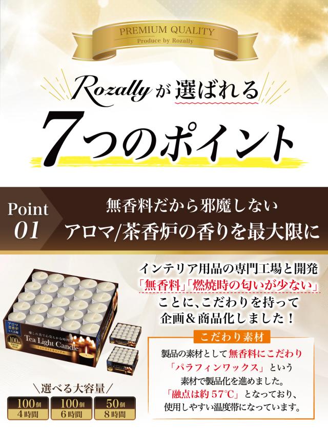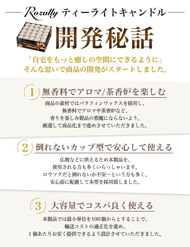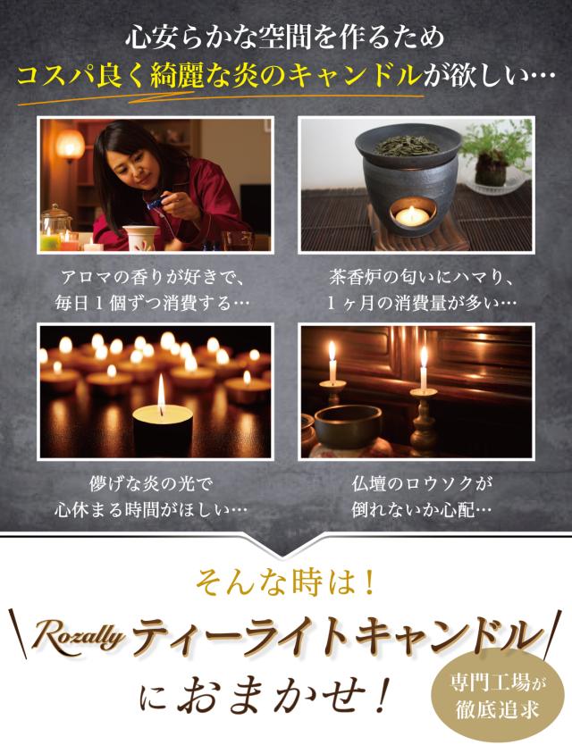 様々なメーカーから 業務用 家庭用 として ”アルミカップ ティーライトキャンドル ”や ”クリアカップ ティーライトキャンドル ”が 日本製/中国製など様々に販売されていますが、 Rozallyの ティーライトキャンドル は”こだわり”が一味違います。 「大容量のセット」で1個あたりの単価を抑えて、 「無香料」で他の香りを邪魔せずに使うことができます。 |