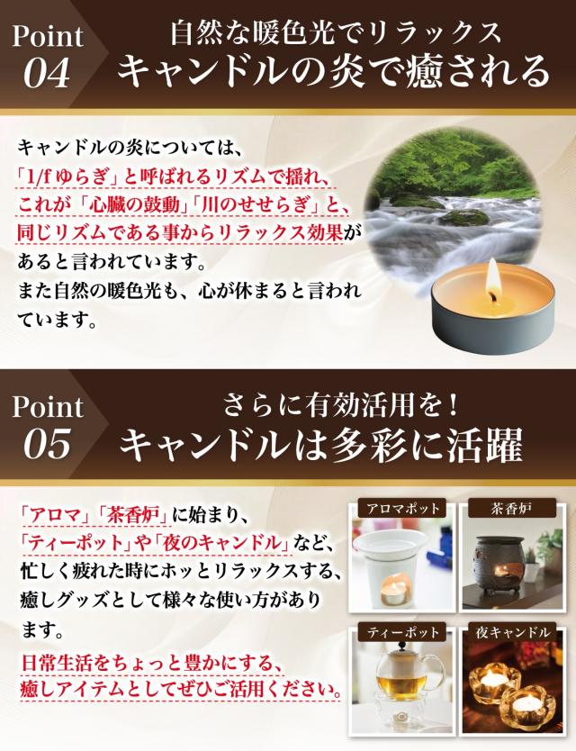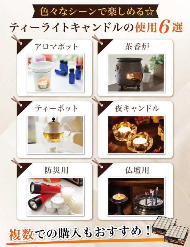 ティーライトキャンドルはさまざまな場面で活躍する製品です。 【1】アロマポット用に無香料で楽しみたい 【2】茶香炉用に長時間使えるタイプが良い 【3】ティーポットをおしゃれに温めるため 【4】夜キャンドルで儚い炎に癒される 【5】防災用に被災した時のための保存に 【6】仏壇用に倒れないロウソクとして |