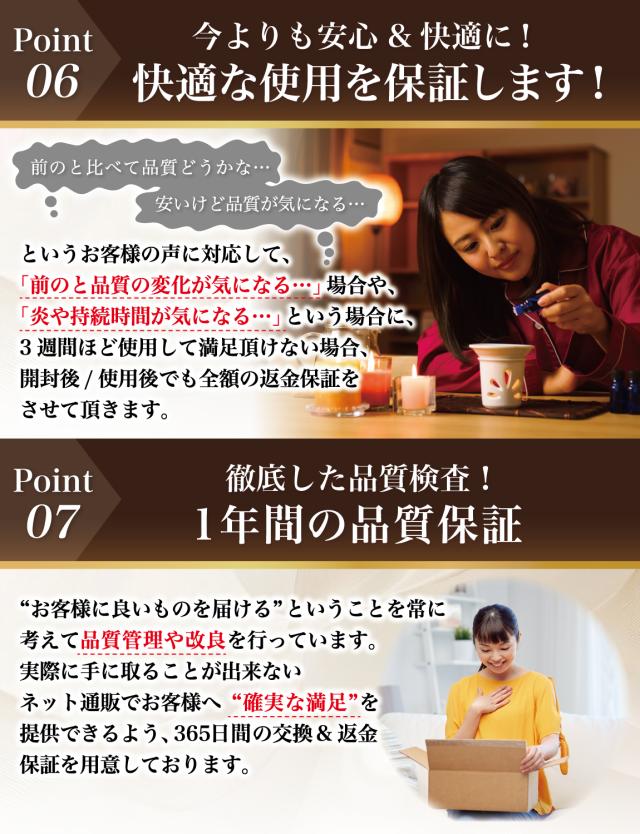 Rozally ティーライトキャンドル は品質にこだわり、 工場と交渉をおこなってアルミカップの素材選定から進めています。 出荷前の検品などは十分に行わせて頂いているのですが、 輸送中に破損や汚れの付着など稀に発生してしまうケースがあります。 不具合などが発生してしまった場合でも、 製品には1年間の長期保証を付属させて頂いておりますので、 すぐに交換品の手配をさせて頂きます。 また本製品には効果を実感して頂くことを最優先に考え、 「2週間ほど使用しても快適さが全く実感できなかった」という場合に、 ”開封後”でも”使用済み”でも全額の返金保証を付属させて頂いております。 |