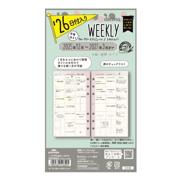 【メール便発送】レイメイ藤井 decona デコナ 手帳用リフィル 2026年 聖書サイズ 週間-1 片面1週間+6パート HWR26005