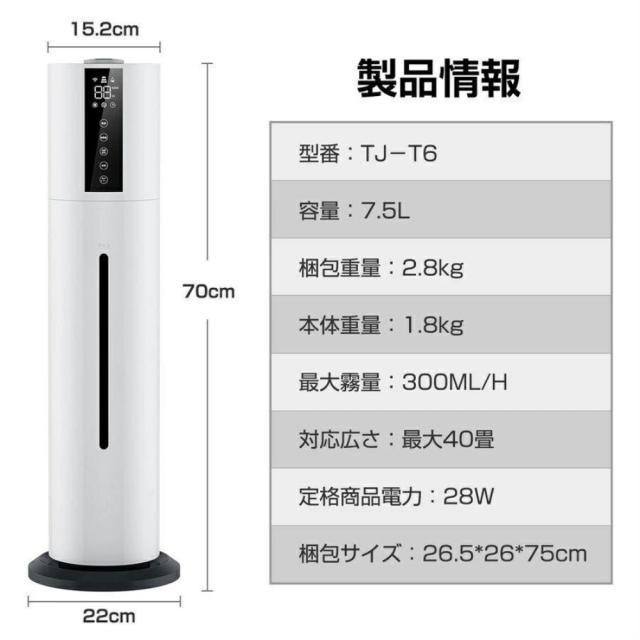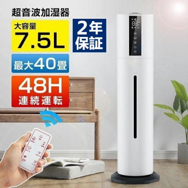 加湿器 大容量 タワー型 7.5L UV除菌ライト&湿度設定 超音波加湿器 次亜塩素酸水対応 吹出し口360°回転 おしゃれ 床置き アロマ対応 オフィス 部屋 上から給水 タイマー付き 静音 リモコン付 タバコ ペット 花粉症 ホコリ 脱臭 寝室 家庭用