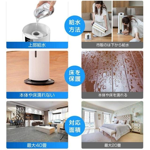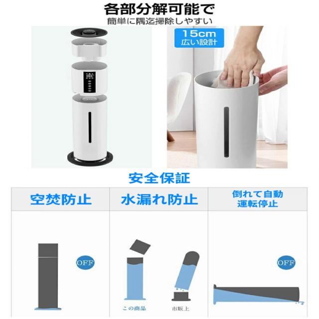 ・加湿器には空焚き防止機能が付いており、水量が少なすぎると自動的に加湿を停止し、赤ライトが点灯します。夜寝る時でも加湿器の水切れの心配はありません。上部給水方式なので、蓋を開けて直接水を補充することができます。(ご注意:最大水位は中軸導管より高くしないでください。)