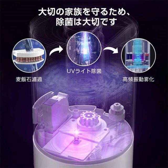 ・UVライトは抗菌機能があり、UVボタンを触れるとライトが点灯し、水中の細菌を99%取り除きます。この加湿器は清潔なミストを噴出することができます。また、水溶性のアロマオイルにも対応しており、お好みのアロマオイルをタンクに入れることで部屋全体に心地よい香りが広がります。(注意:次亜塩素酸水を使用したい場合は希釈してください。50ppm以下の濃度がおすすめです)