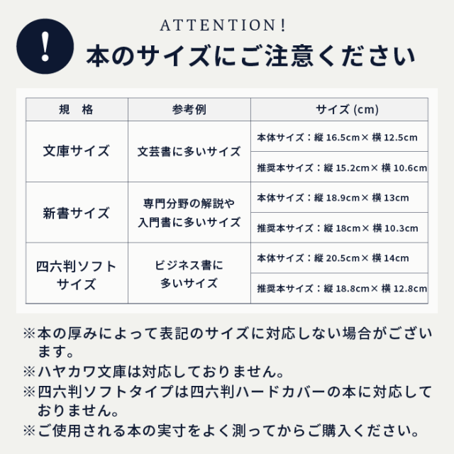 ※注意:四六判サイズはソフトカバー限定です。ハードカバーはお使いいただけません。文庫サイズはカドカワ文庫/新型ハヤカワ文庫はお使いいただけません。出版時期によってサイズが異なる場合がございますので、実寸をご確認ください。