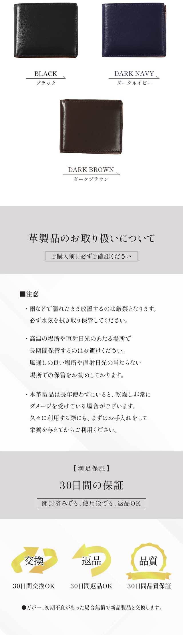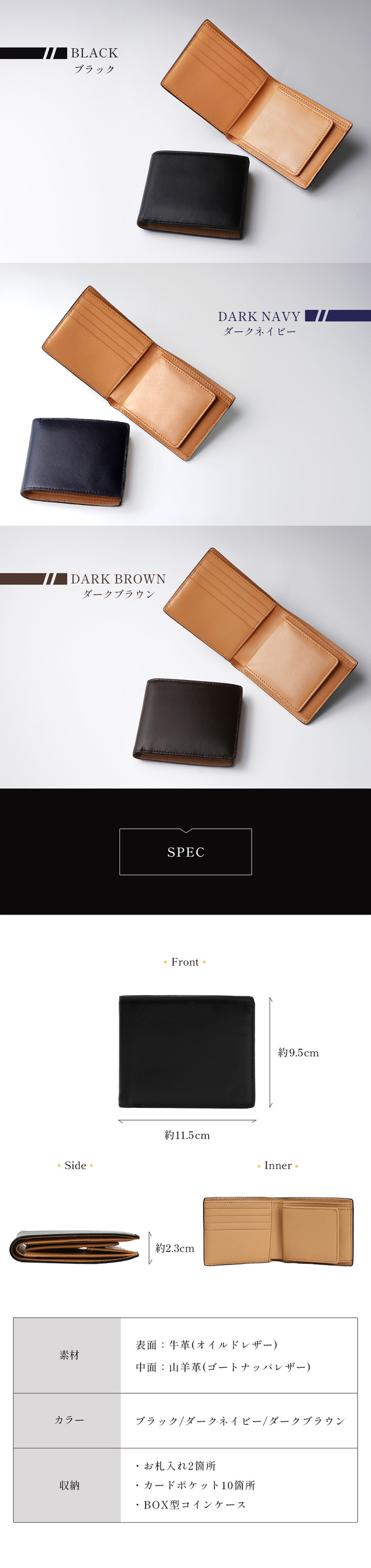 カラー:ブラック、ダークネイビー、ダークブラウン