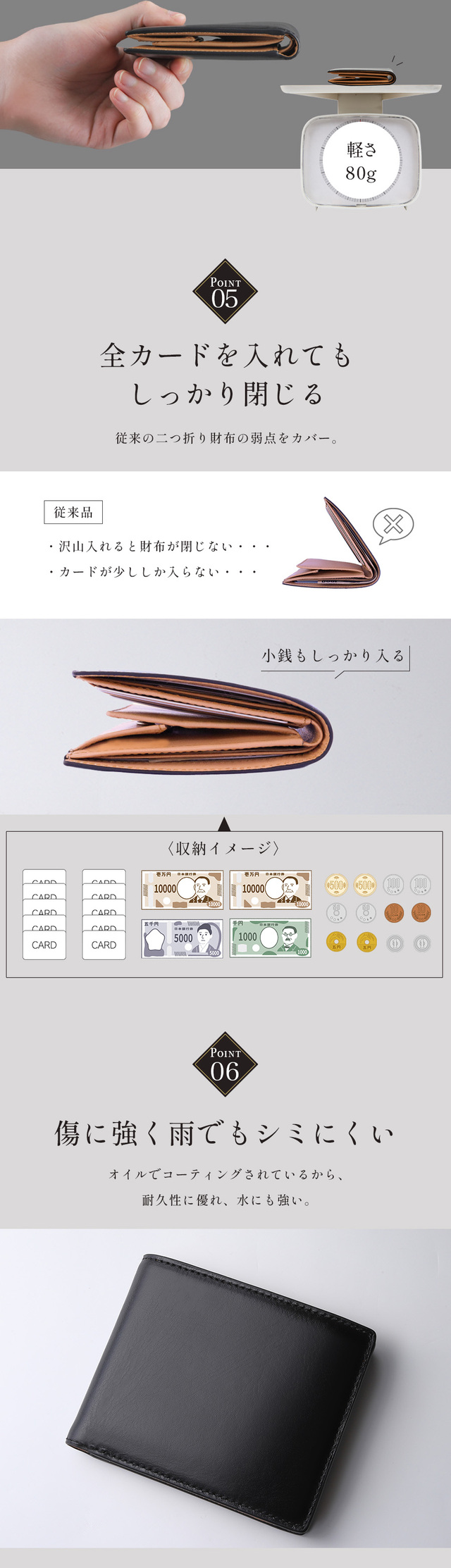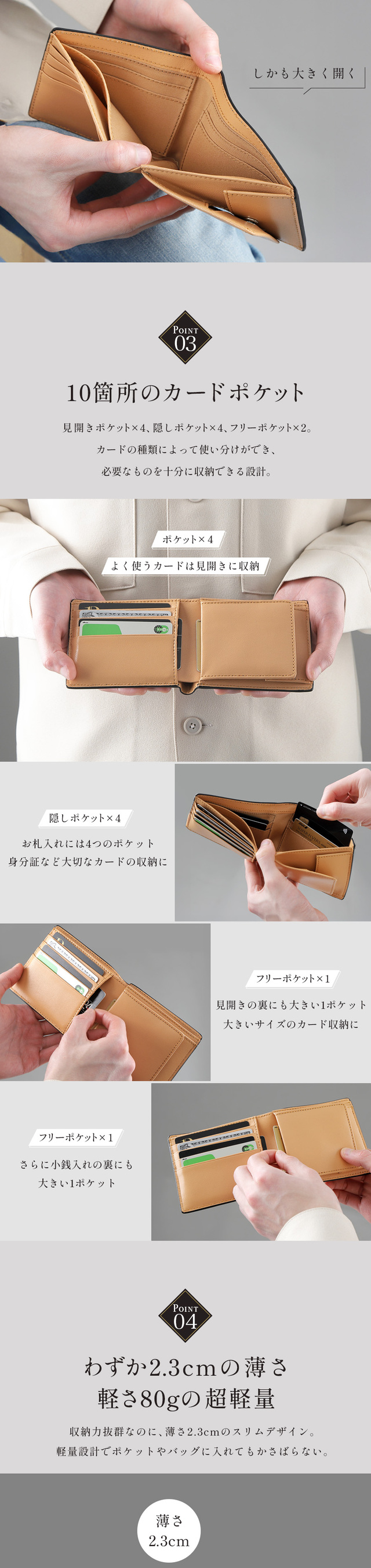 お札入れ2箇所の仕切り有りタイプで、カード収納は10枚(カードポケット8箇所、フリーポケット2箇所)あります。