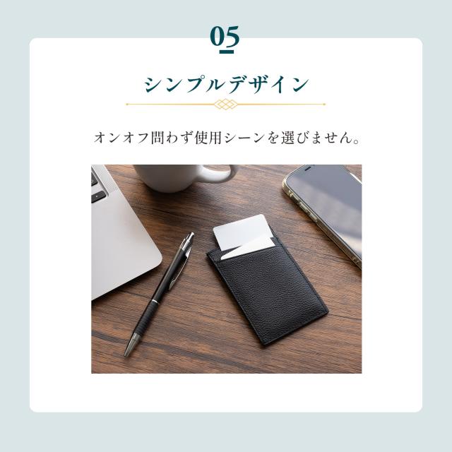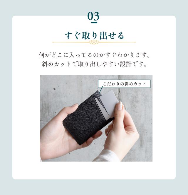 カードを入れた際のバランスを細かく設計しました。カードがはみ出る長さを最小限にし、挿入口を斜めカットにすることで取り出しやすくしています。また、縦型収納でよりスマートな印象に仕上げました。