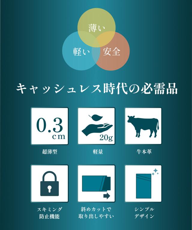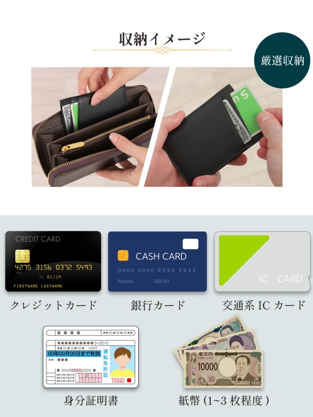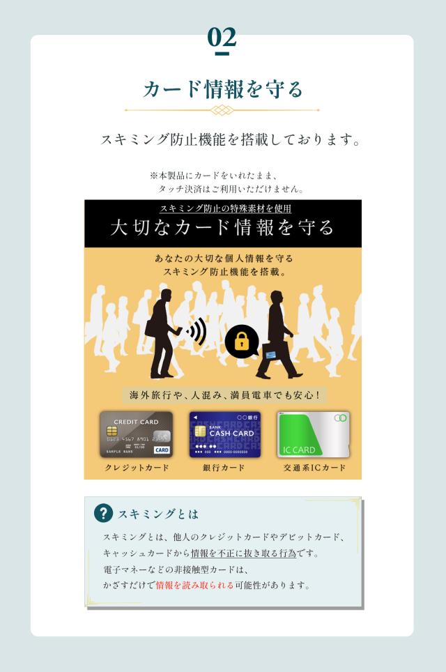 カード情報や個人情報を保護するスキミング防止機能があります。全てのポケットに搭載しているので、人混みや満員電車、海外旅行でも安心してお使いいただけます。※本商品にカードを収納したまま、タッチ決済はご利用いただけません