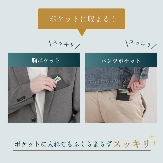 コンパクトさを追求し、厚さわずか3mmの超薄型デザイン。手のひらサイズに収まるサイズ感です。従来のカードケースと比較しても薄型で軽量なので、胸ポケットやズボンのポケットに入れてもかさばりません。