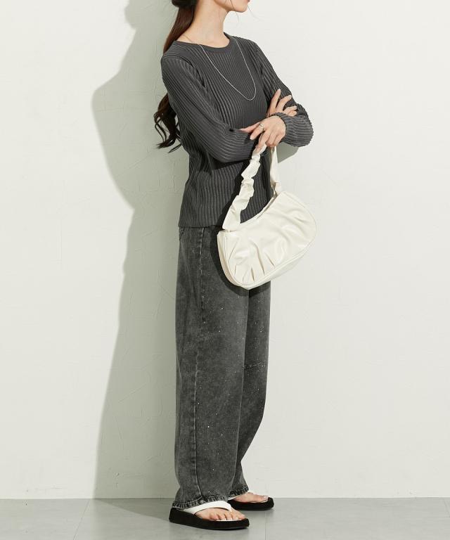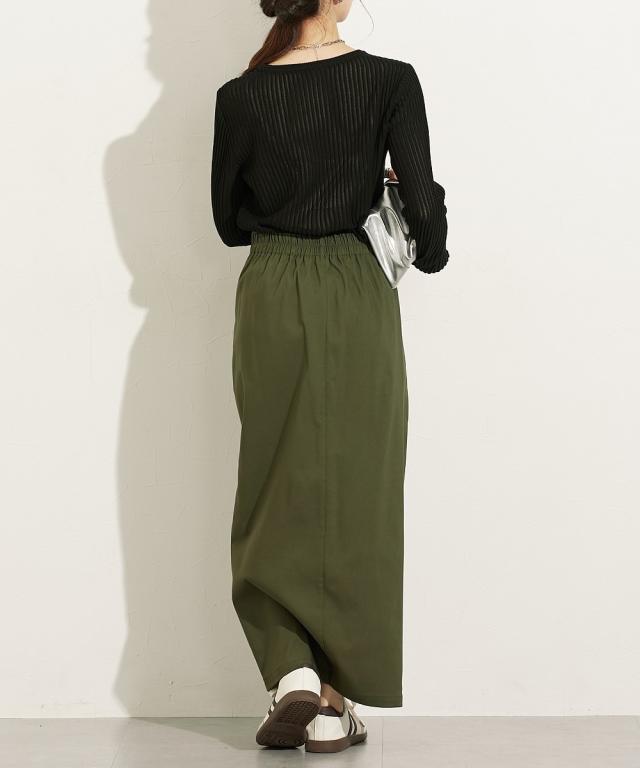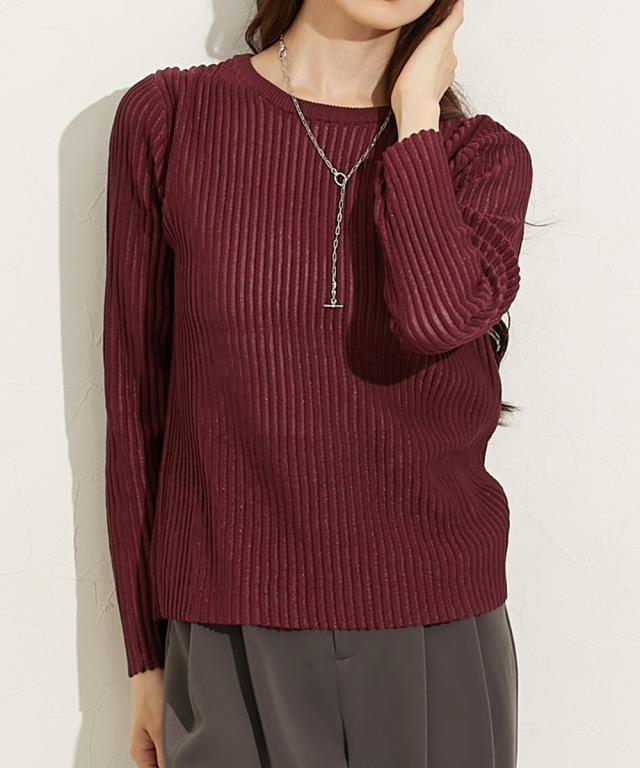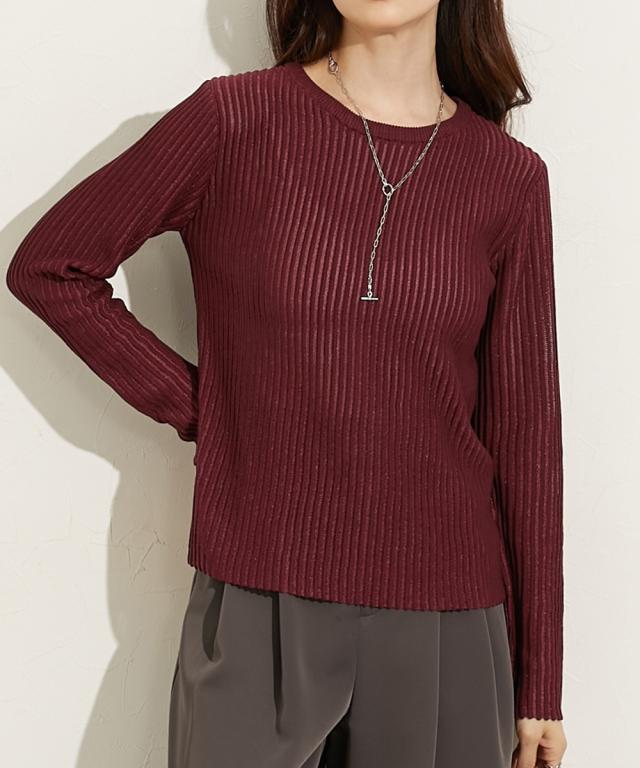 ■デザイントレンドのシアーニットのリブ仕様。リブの畝のところがシアーになっているので程よい透け感があります。■素材麻調のシャリっとした素材感が特徴。レーヨン混なので柔らかめの肌触りに仕立てています。■おすすめのスタイリング同色系のインナーを合わせてコーデするのが今年らしくておすすめです。