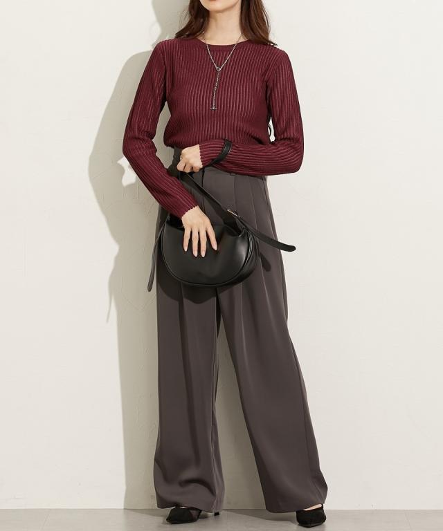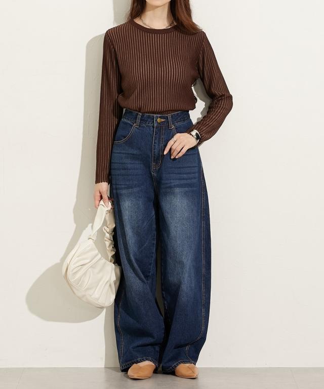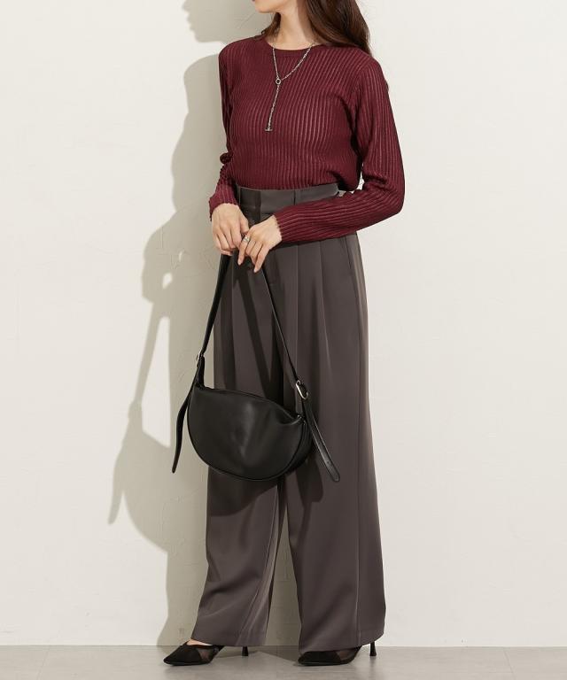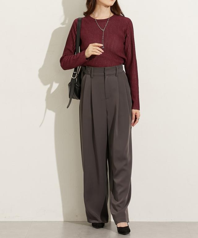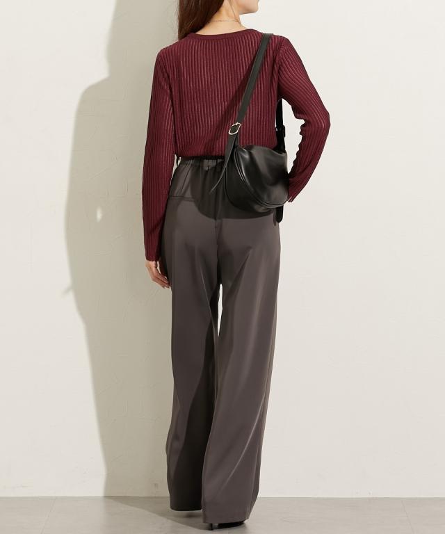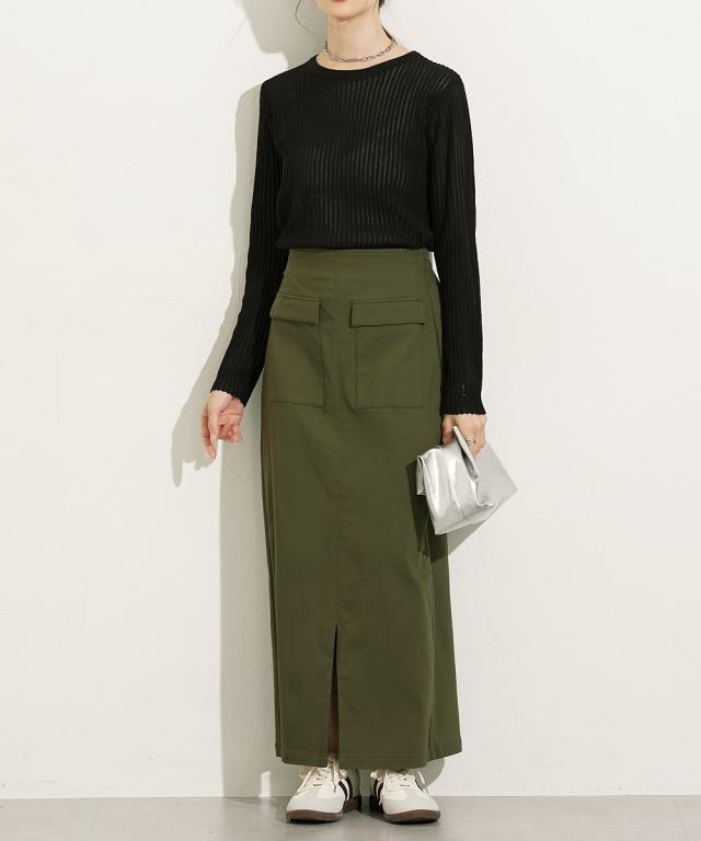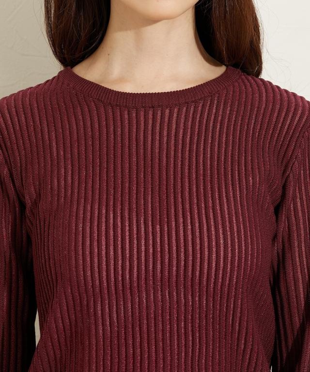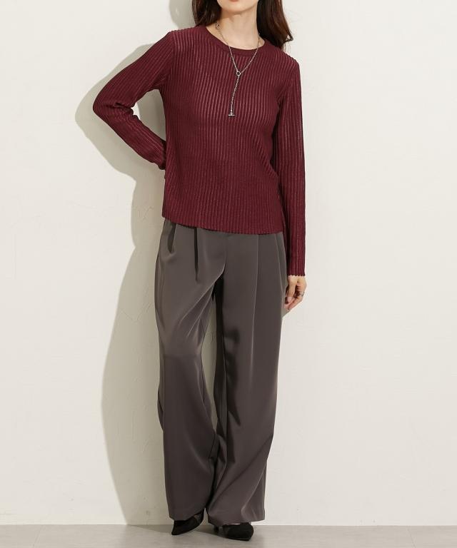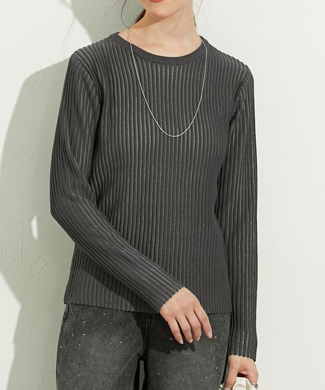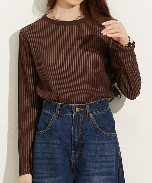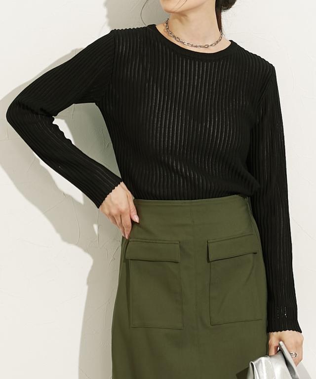 ■デザイントレンドのシアーニットのリブ仕様。リブの畝のところがシアーになっているので程よい透け感があります。■素材麻調のシャリっとした素材感が特徴。レーヨン混なので柔らかめの肌触りに仕立てています。■おすすめのスタイリング同色系のインナーを合わせてコーデするのが今年らしくておすすめです。