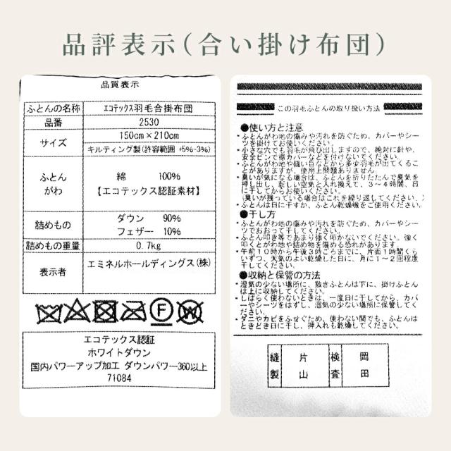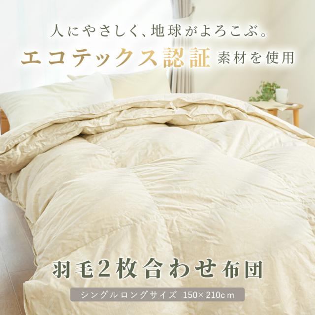 ・掛け布団のお悩みもこれでさよなら!年中使えるちょうどいい羽毛布団 合い掛け布団と肌掛け布団を重ねることで、冬も暖かく、季節に応じて使い分けできます。1年中快適に使える便利な布団で、掛け布団のお悩みも今日で解決! ・世界最高水準の安全性を誇る エコテックス認証(R)素材を使用生地や中の羽毛だけでなく縫い糸・マチテープ・品質表示にいたるまで、製品に使われるすべての部材が認証をクリア。安心・安全、環境にも配慮した羽毛布団に仕上がりました。 ・エコテックスとは?