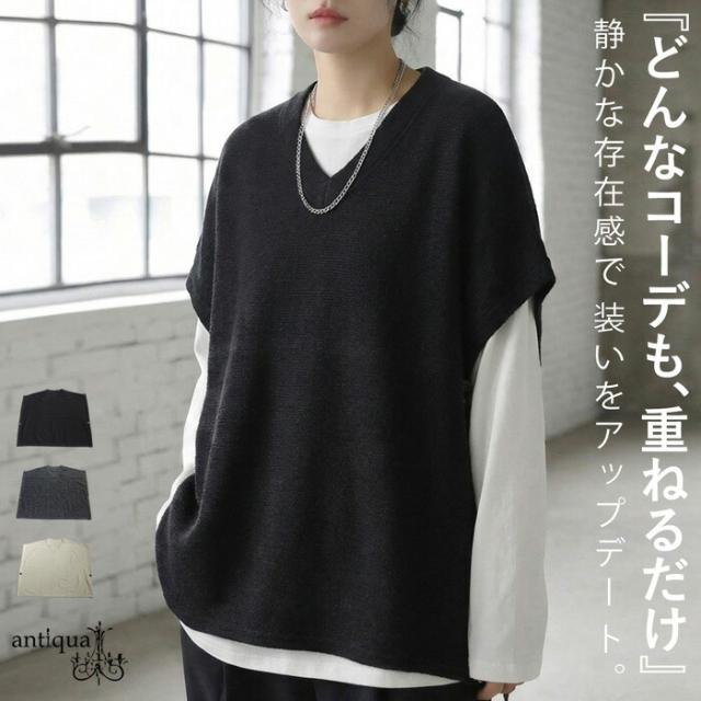 aj-01922 ニットベスト Vネックベスト レイヤードベスト プルオーバー サイドボタン サイドスリット ボックスシルエット 羽織り 無地 おしゃれ 上品 重ね着 大人 体型カバー 着痩せ