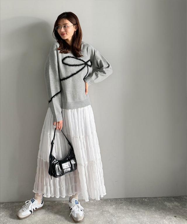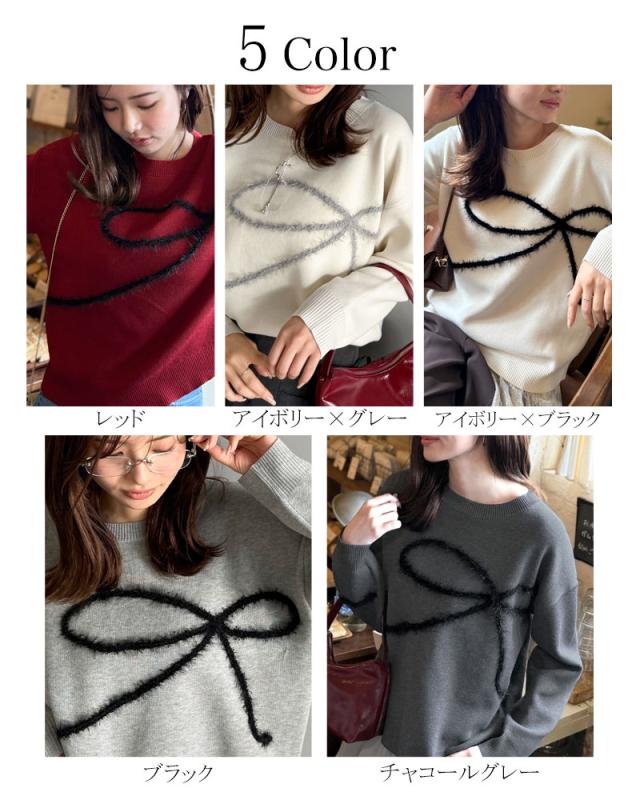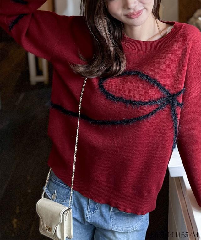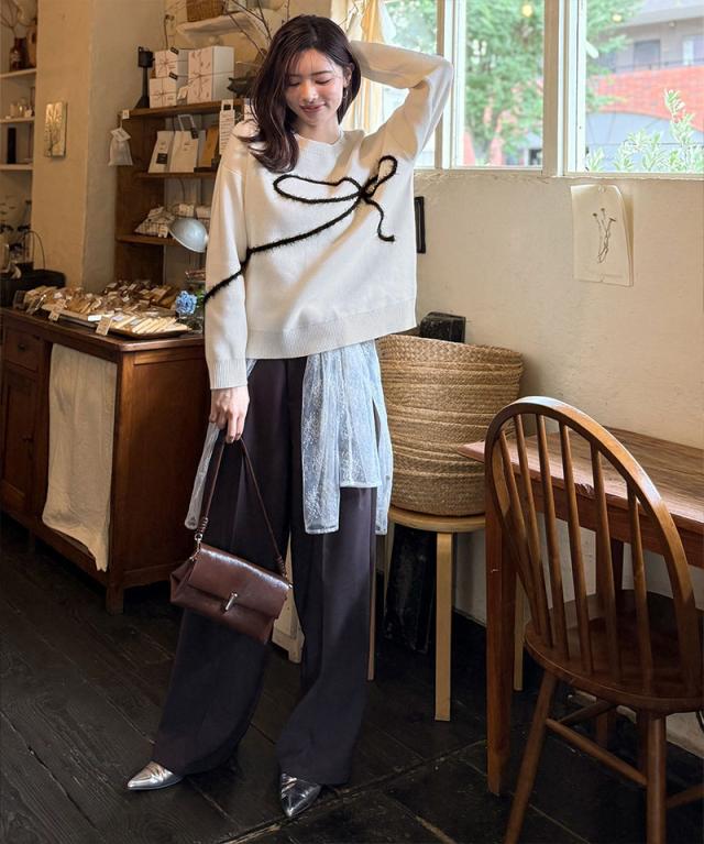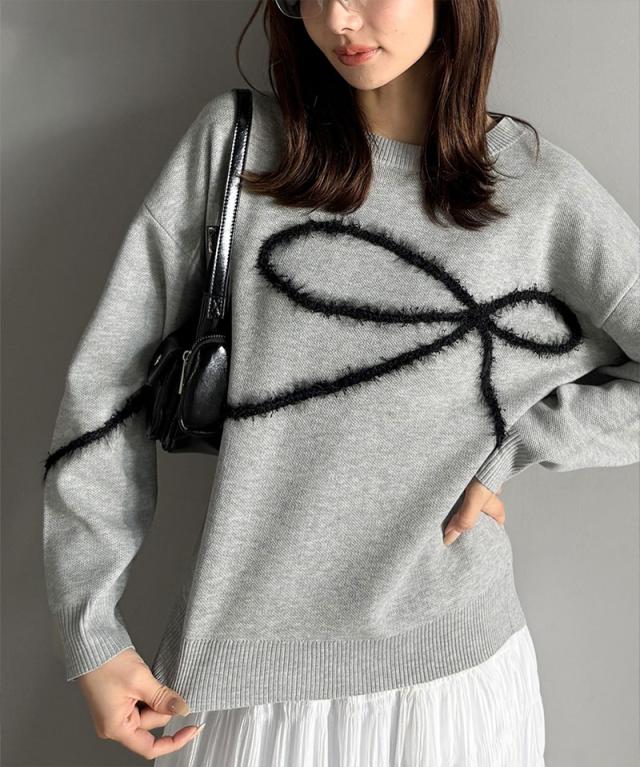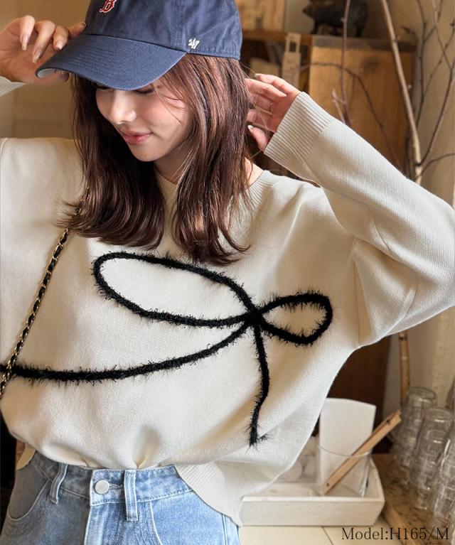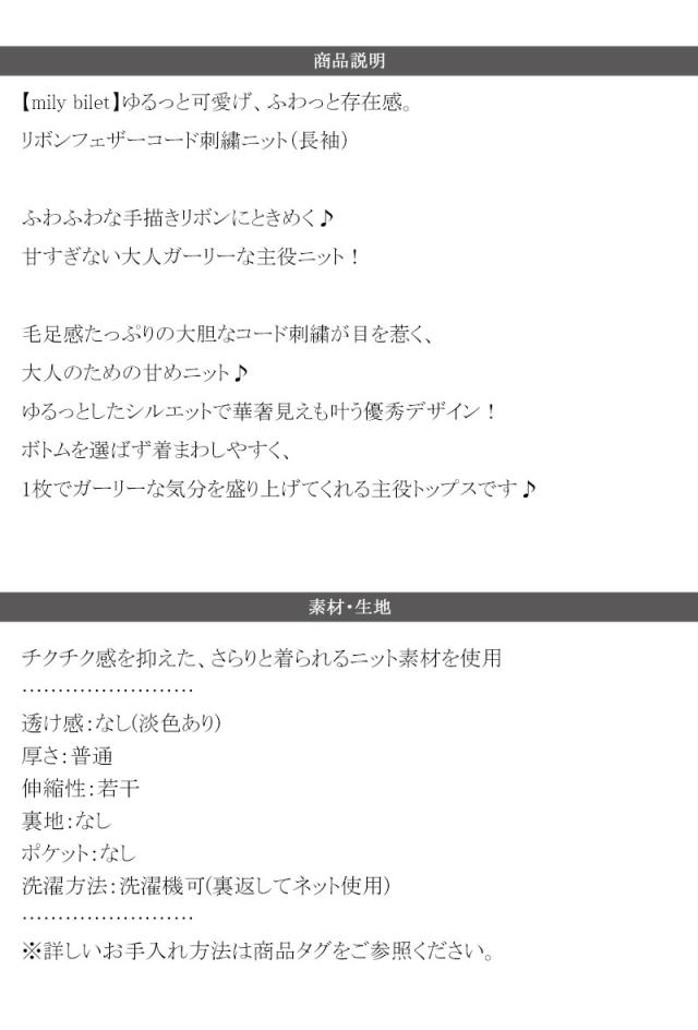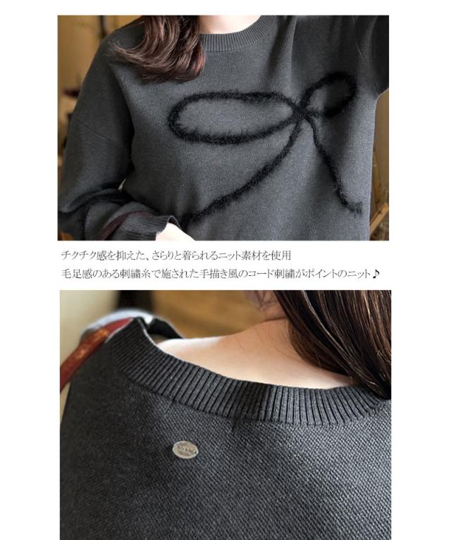 クラシカルエルフ冬新作 mily biletトップス 長袖 レディース ニット リボン フェザー 手描き風 コード刺繍 ロゴプレート 長袖 ゆるっと おしゃれ オーバーサイズ 大きいサイズ 2025aw mi1029130