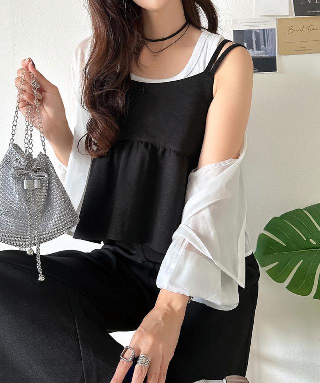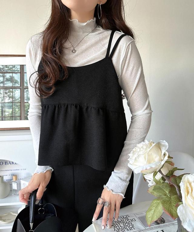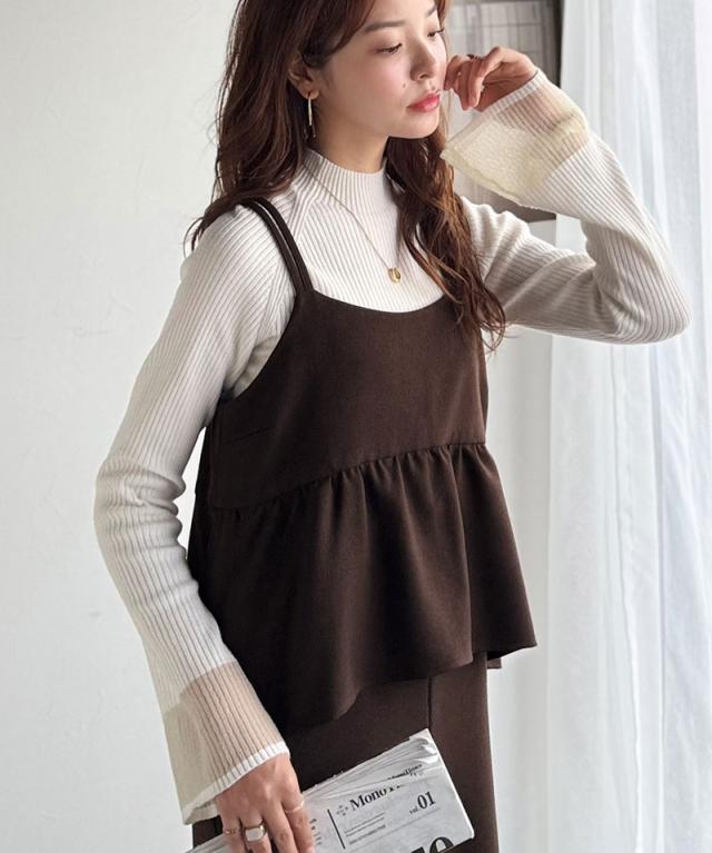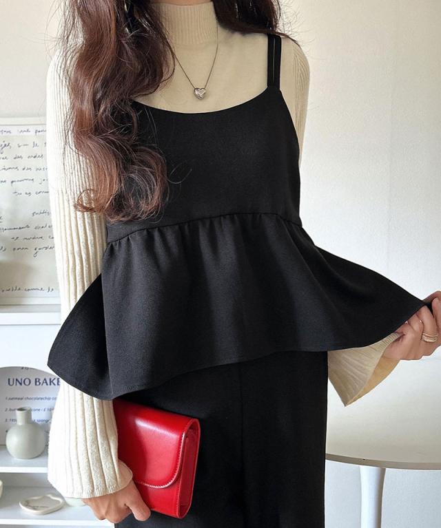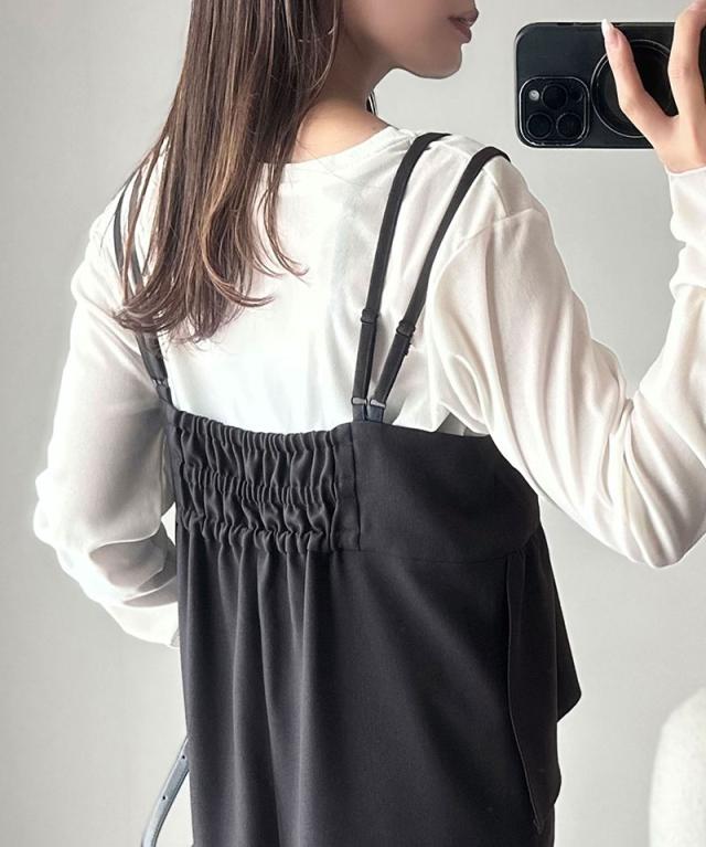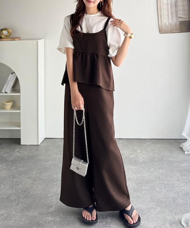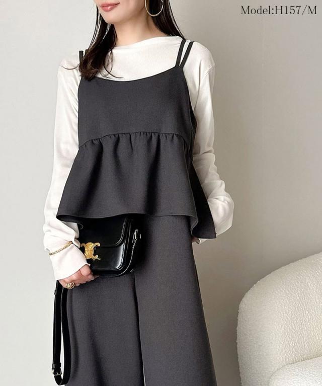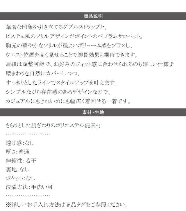 ビスチェ風のフリルデザインがポイントのペプラムサロペット。