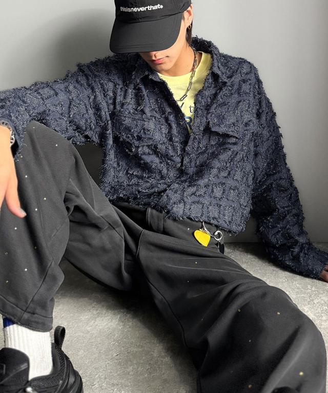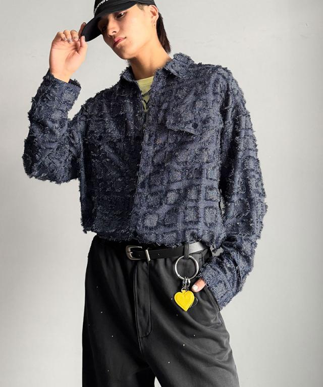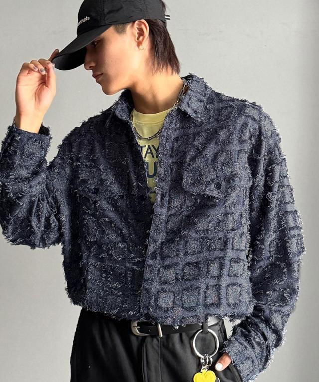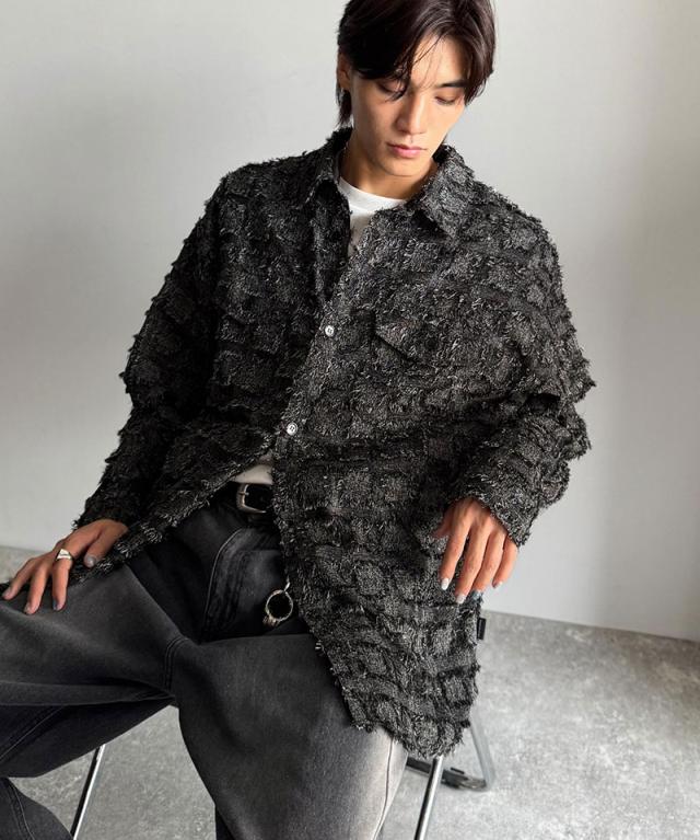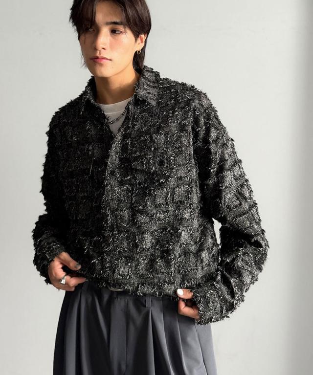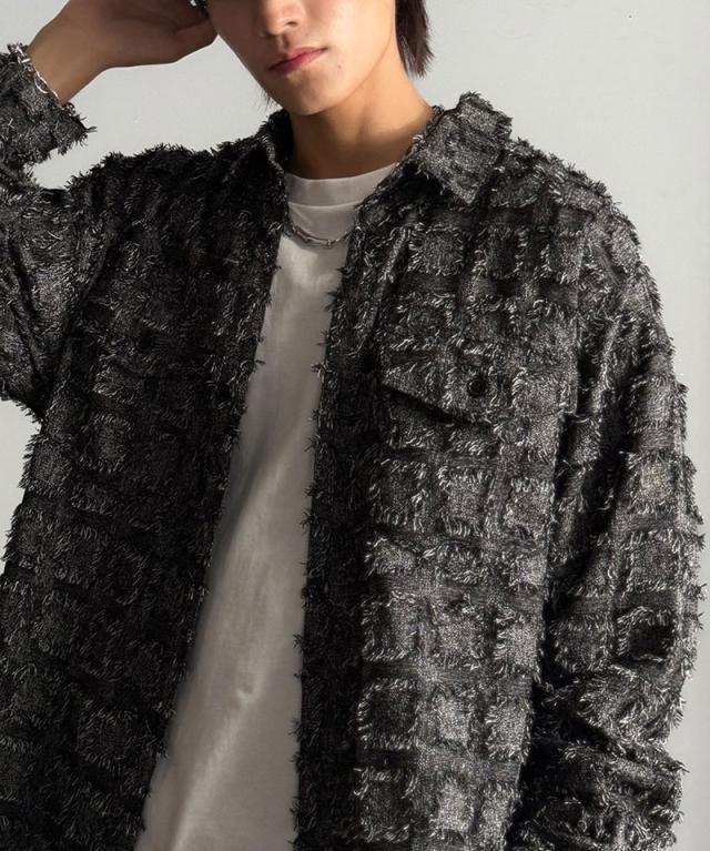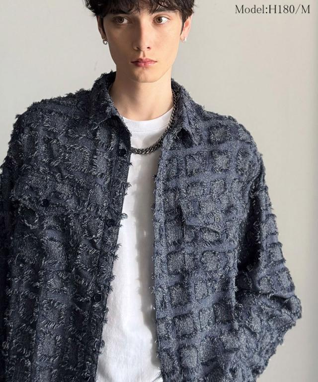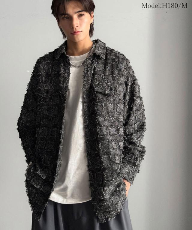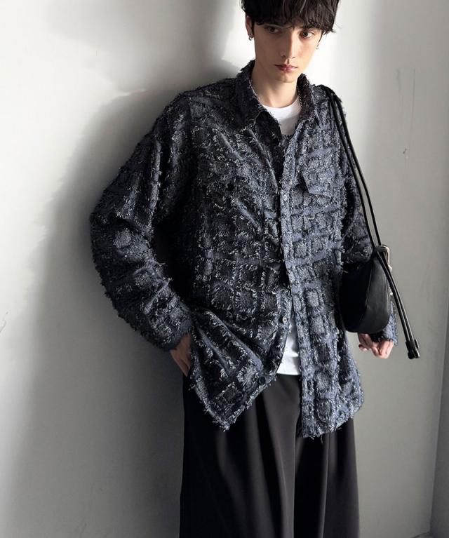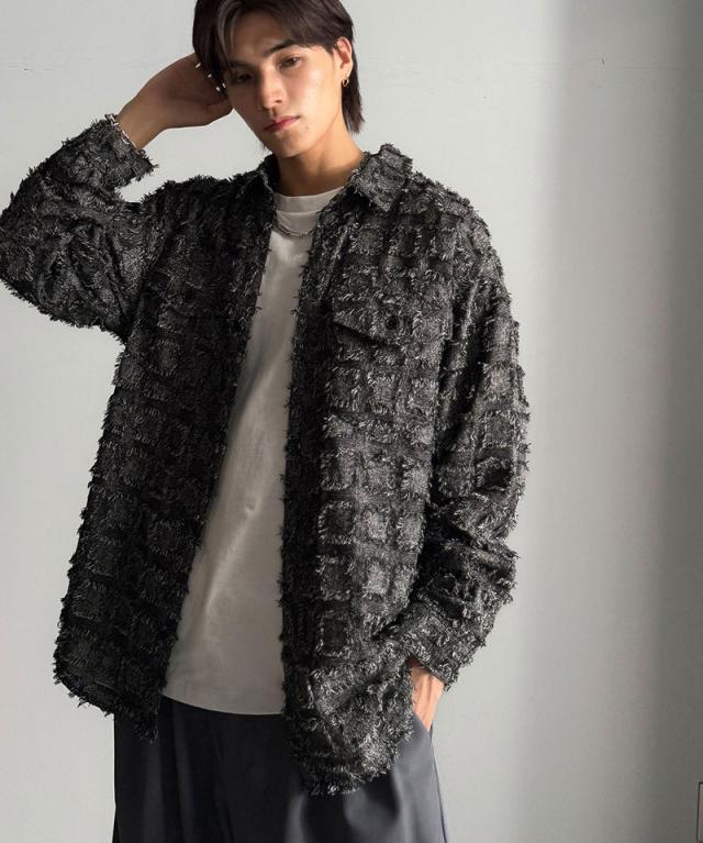 フリンジ使いブロックチェックアウターシャツは、存在感のあるデザインが特徴。