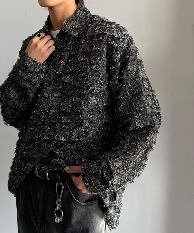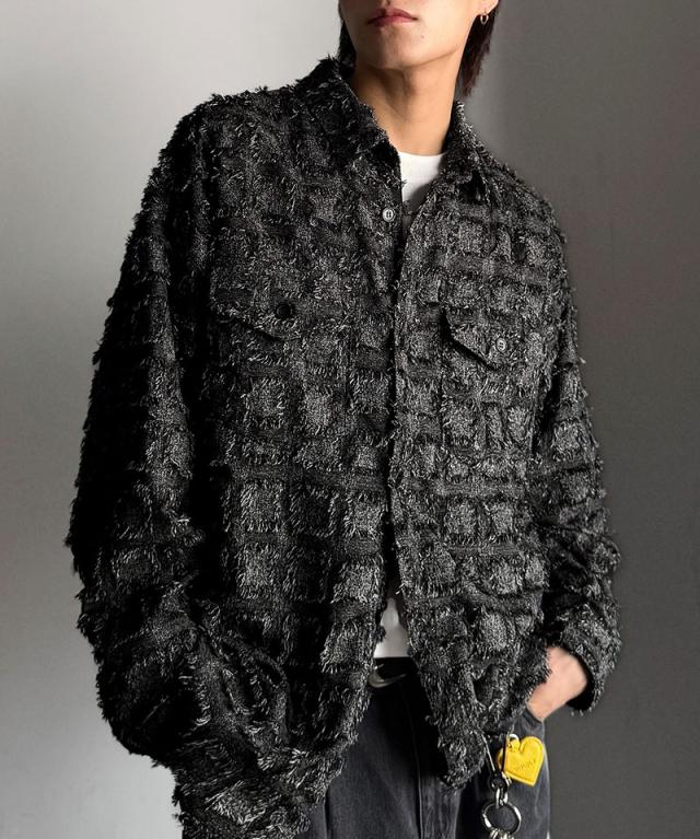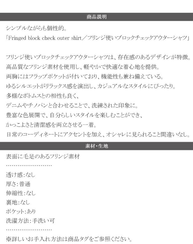 「Fringed block check outer shirt/フリンジ使いブロックチェックアウターシャツ」