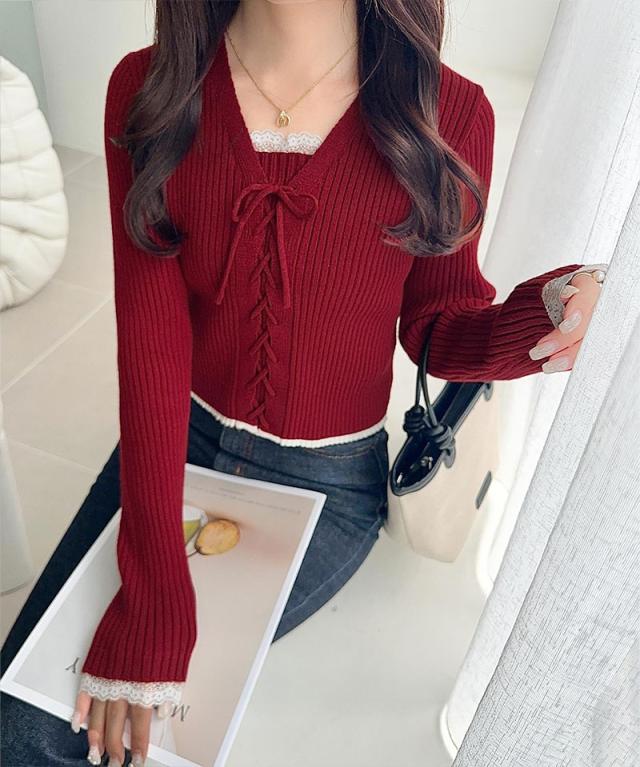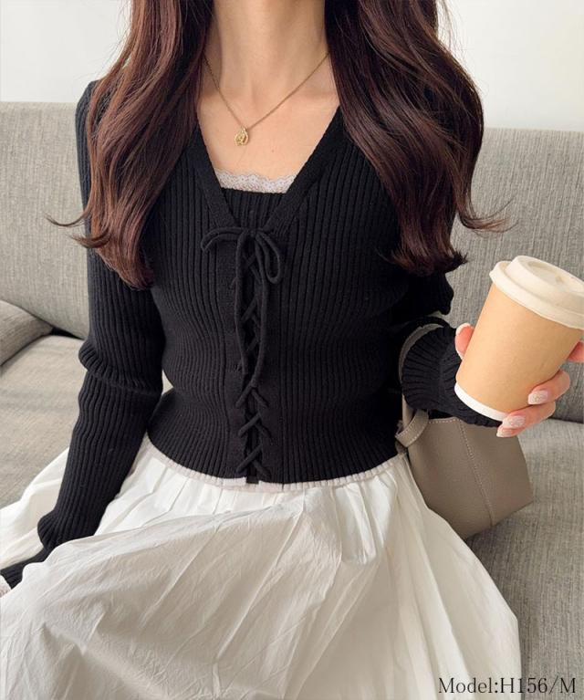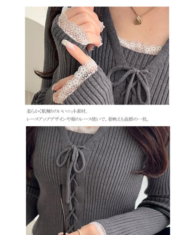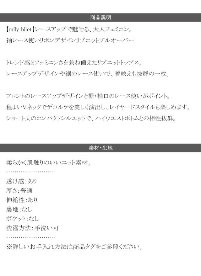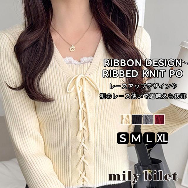 クラシカルエルフ冬新作 mily bilet トップス ニット レディース レースアップ 袖 レース 使い リボン デザイン リブニット プルオーバー 長袖 コンパクト 大きいサイズ 2025aw mi1029158