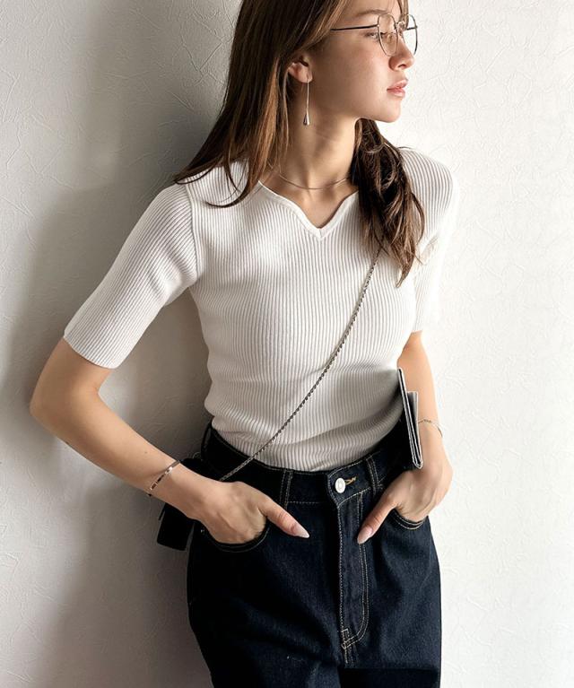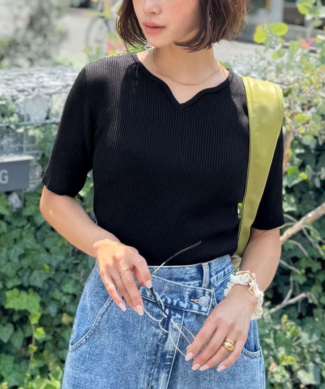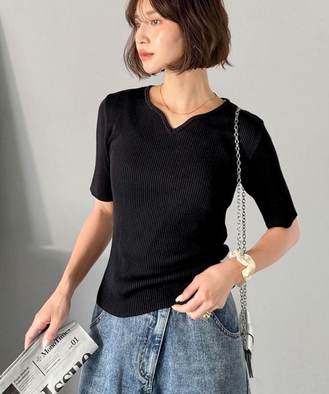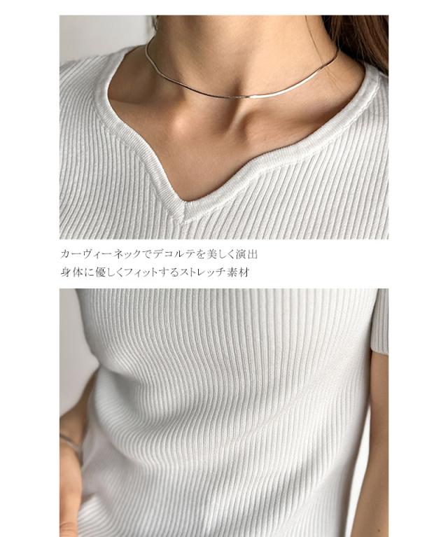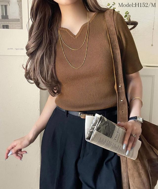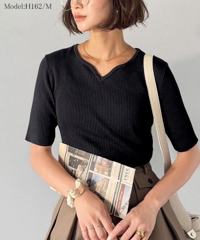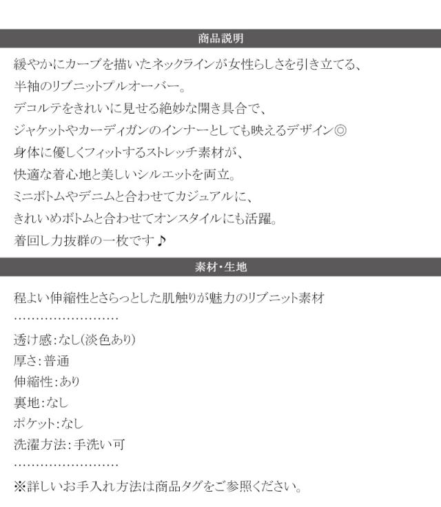 緩やかにカーブを描いたネックラインが女性らしさを引き立てる、半袖のリブニットプルオーバー。