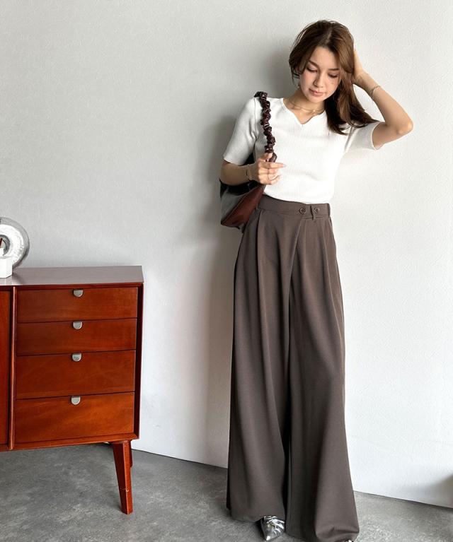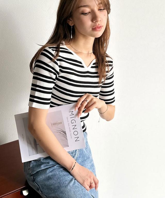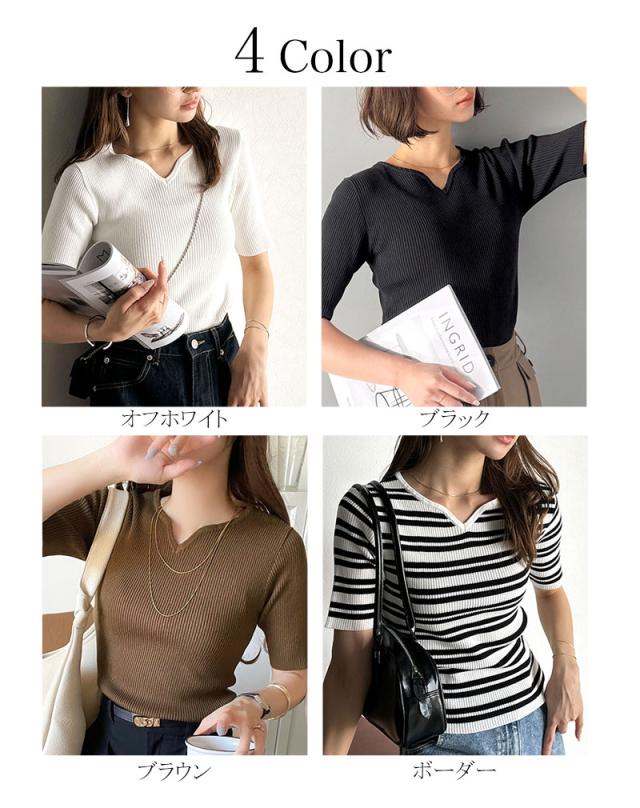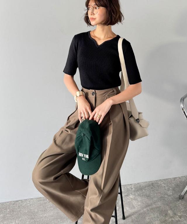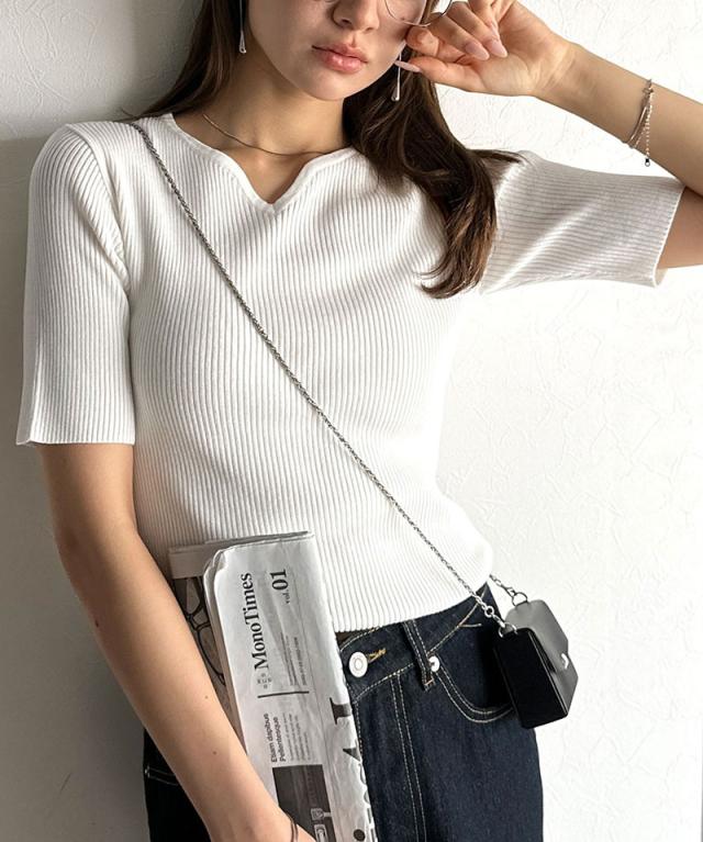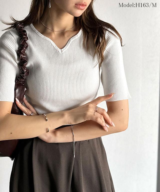 緩やかにカーブを描いたネックラインが女性らしさを引き立てる、半袖のリブニットプルオーバー。