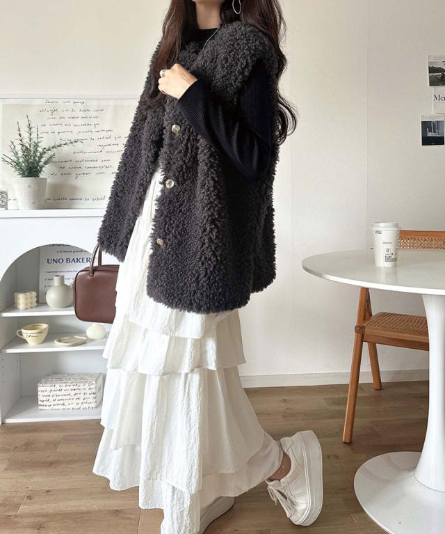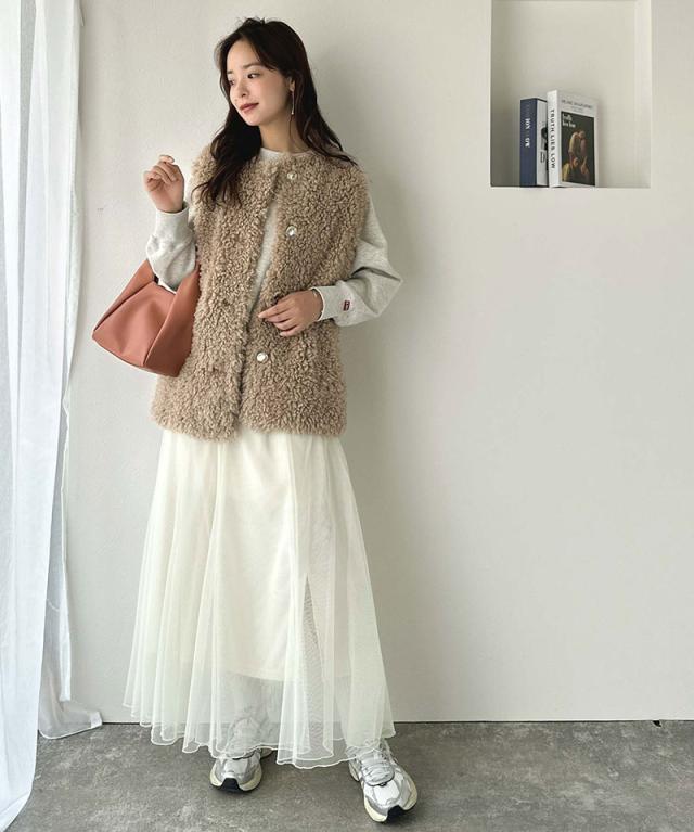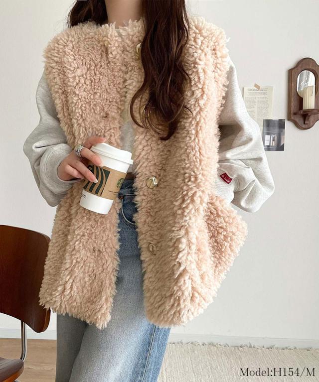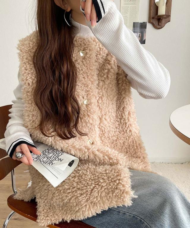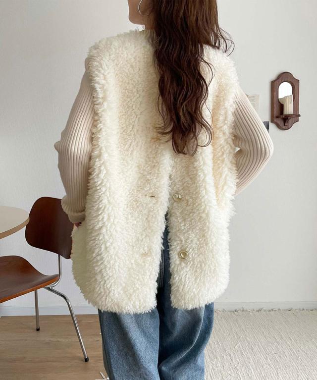 ふわふわのプードルボア素材で仕立てた、見た目も暖かさも文句なしの2wayベスト。