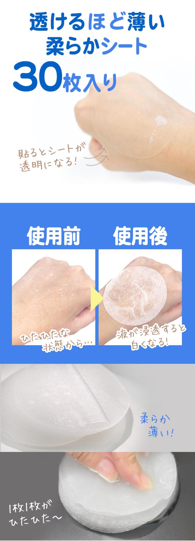 毎日使用できます。 洗顔後、シートを1枚取り、目の周りを避けお顔全体をやさしく拭き取ります。 部分パックとして水分が必要な部分に5?10分ほど貼ることもおすすめです。 |