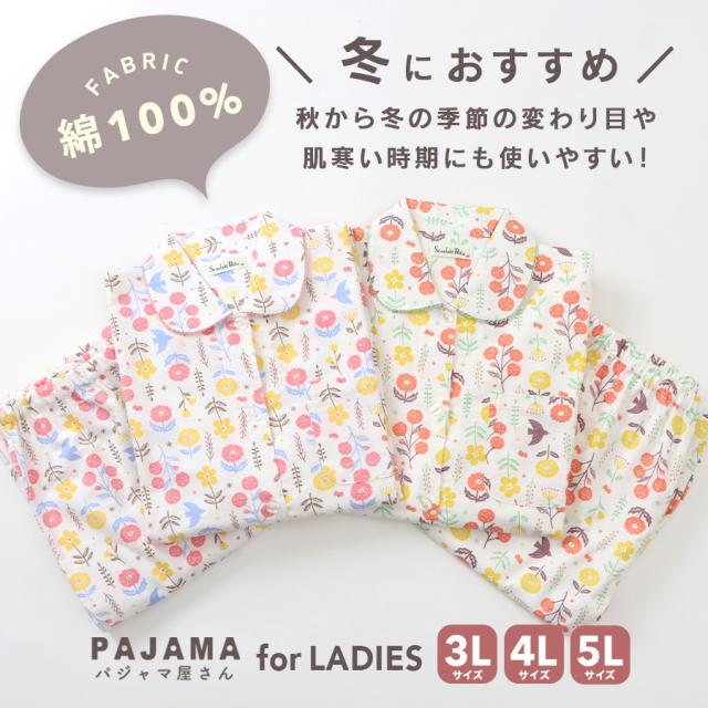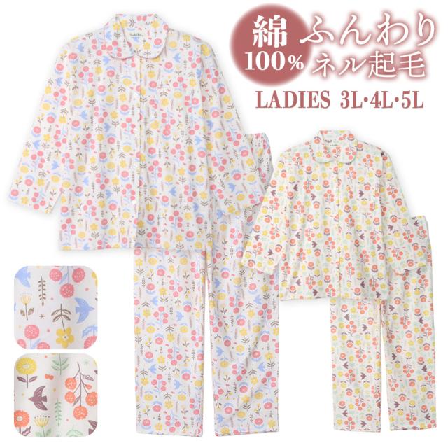 パジャマ レディース 綿100% 長袖 冬向き 前開き ネル起毛 前開き 北欧風のお花柄 アイボリー クリーム 3L 4L 5L かわいい 親子 おそろい 61175big
