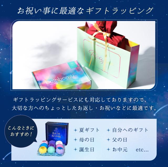 50パターン以上の中から選び抜いた、夏の夜空をイメージしたとっておきのデザインでバスボムを包みました。