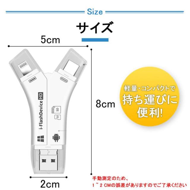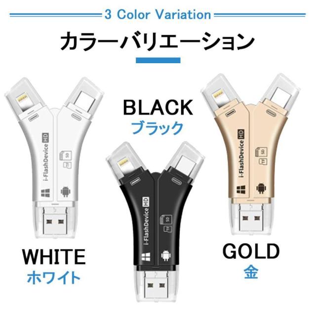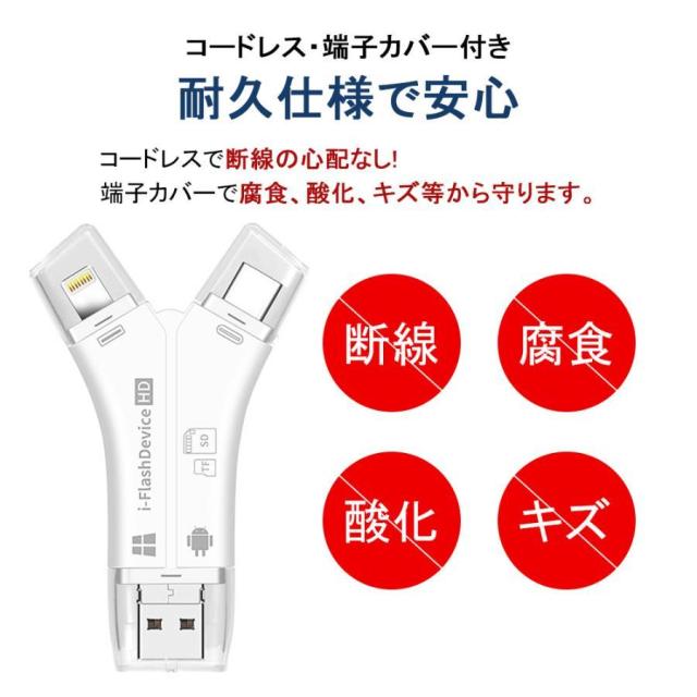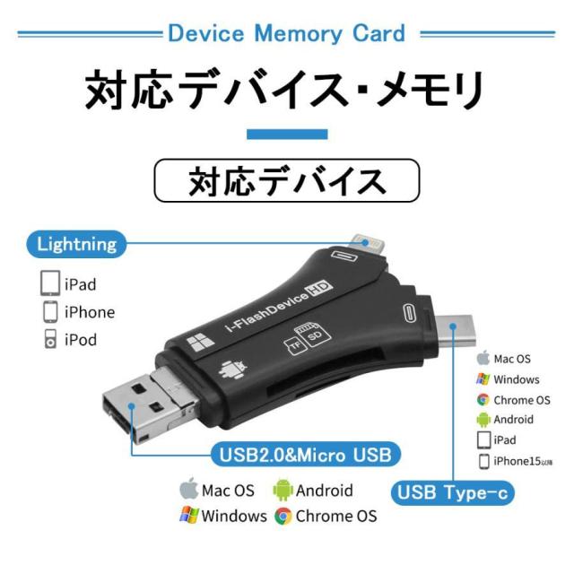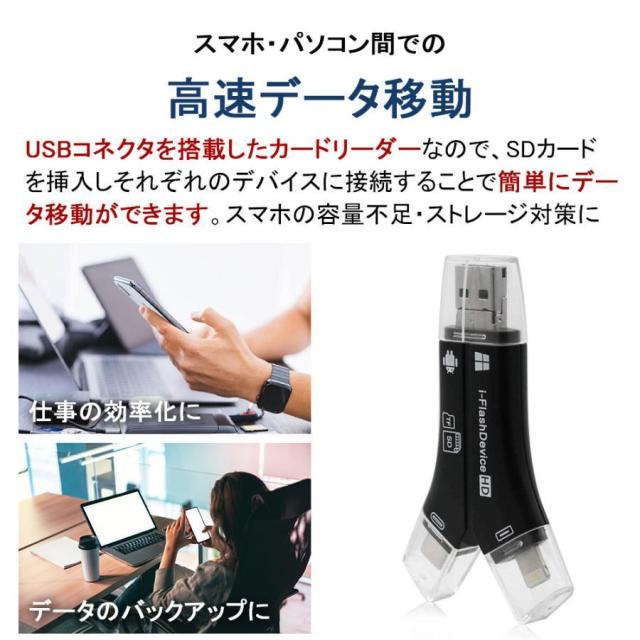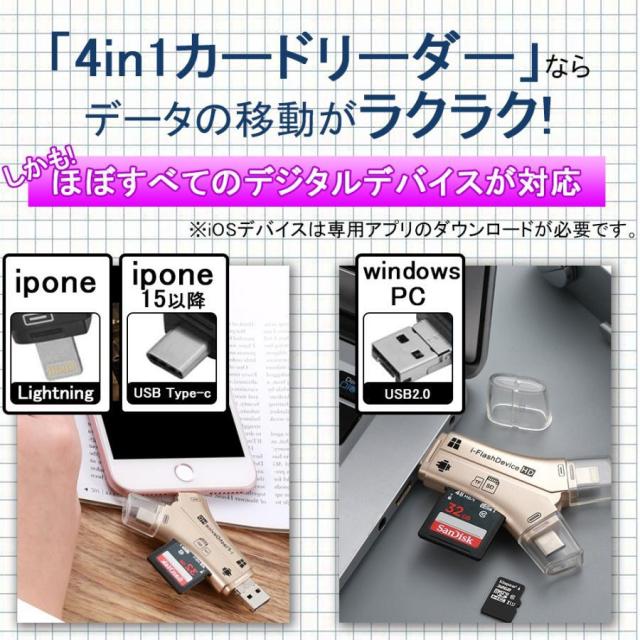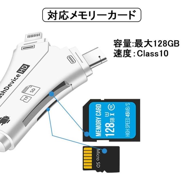 SDカードリーダー iPhone バックアップ アダプター 読み取り USBメモリ 写真 保存 スマホ データ 高速移行 スマホ カメラリーダー 音楽 4in1 容量不足解決