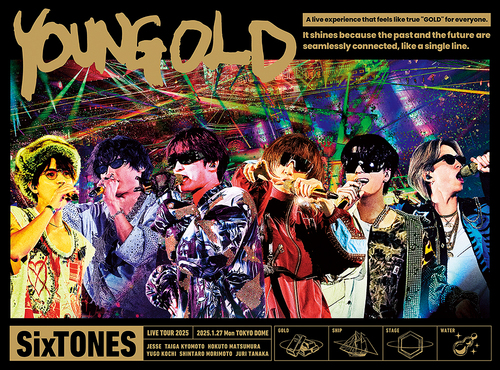 今年1〜4月に行われ、61.5万人を動員した、SixTONES初の5大ドームツアー「YOUNG OLD (ヤングオールド)」。そのツアーから、1月27日に行われた「YOUNG OLD」東京公演の最終日を映像化。メインステージにそびえ立つ豪華絢爛な建物のセット、通称"GOLD殿 (ゴールデン)"を背負い、老若男女にとって「GOLD」なライブを届けるため、ダイナミックなパフォーマンスを見せるSixTONES。生バンドによる演奏で音楽への熱量は更に磨きをかけた上で、楽曲によって形状を変えるムービングの花道や巨大な蛇型のフロート、トロッコで会場中を隅々まで回るなど、誰一人置いていかないそのパフォーマンスはまさに「GOLD」。