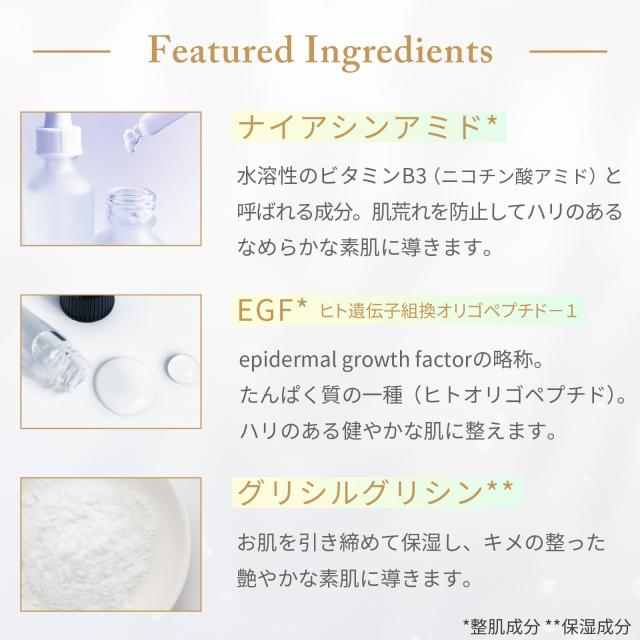 さらに、ナイアシンアミド**、EGF***、グリシルグリシン*を、キメ艶&ハリをアップする成分として配合。