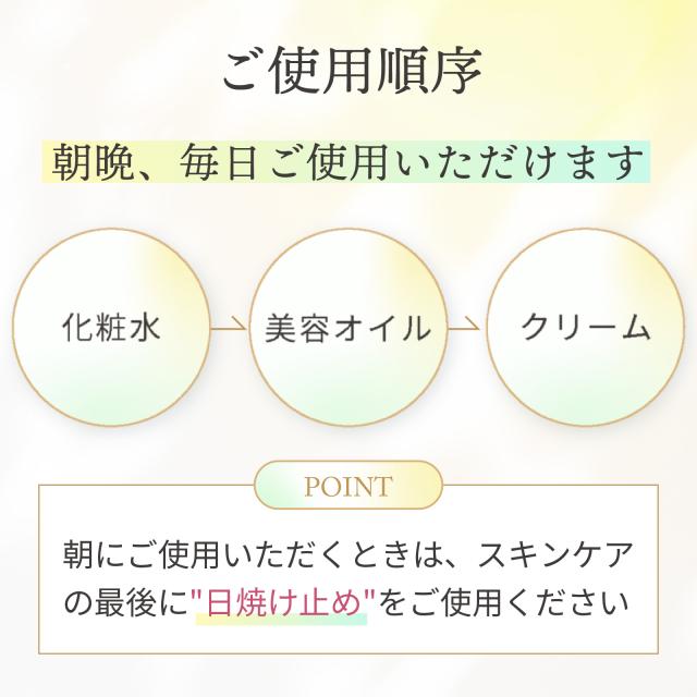 ・ご使用方法: 洗顔した後、適量を手のひらまたはコットンにとり、顔全体から首すじにかけてやさしくなじませてご使用ください。乾燥しやすい目元や口元などは、重ね付けも効果的です。化粧水のあとは、乳液やクリームを塗り、保湿の蓋をしてください。