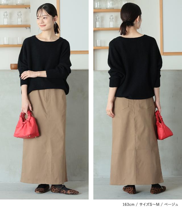 | staff:P/161cm B98 W82 H99 【普段着用】 Tops: LL Bottoms:LL | 【L〜LL】 着丈(ウエスト穿き):くるぶしが見える位 ウエスト:ややゆったり ヒップ:ややゆったり 太もも周り:ややゆったり 全体:ややゆったり ストレッチの効いた素材で動きやすく、ウエストは総ゴムで楽ちんな穿き心地でした。カジュアルにもきれいめにも着まわせる万能スカートです。 【3L】 着丈(ウエスト穿き):くるぶしが隠れる位 ウエスト:ゆったり ヒップ:ゆったり 太もも周り:ゆったり 全体:ゆったり ウエストがぐるっと総ゴムなので、締めつけ感もなく快適です。両サイドと後ろに計4つのポケットが付いていて、実用性もばっちりです! 私の場合は、3Lを選びます。 |
