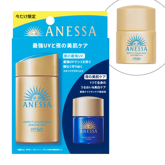 パーフェクトUVスキンケアミルクNAのミニサイズがついたセットです。隙なく守るUVミルクと全身ケアする夜用美容液セット