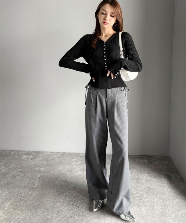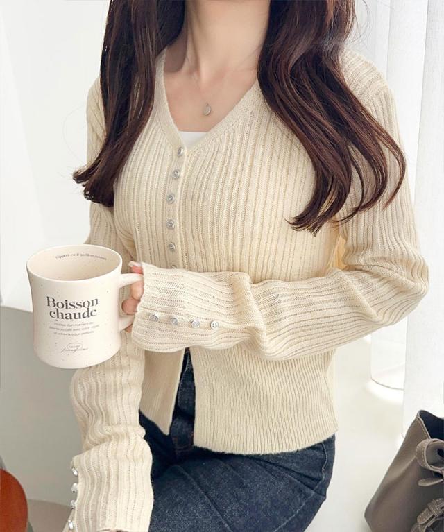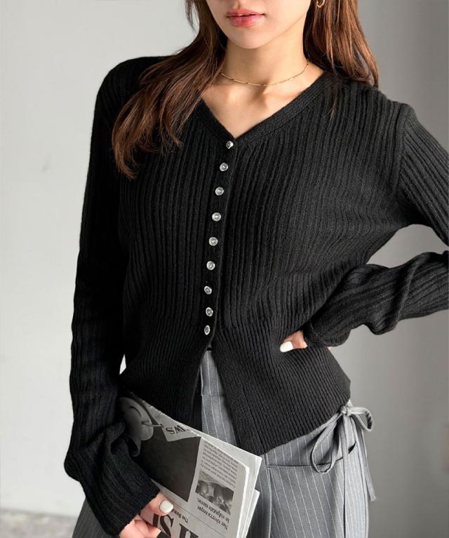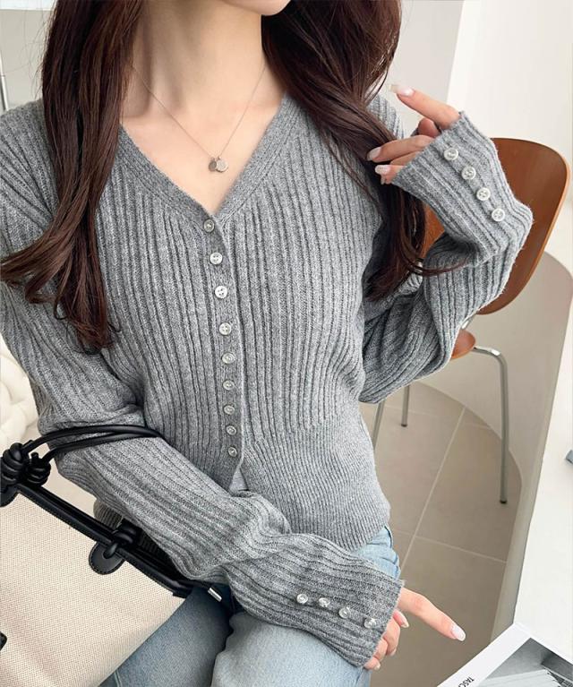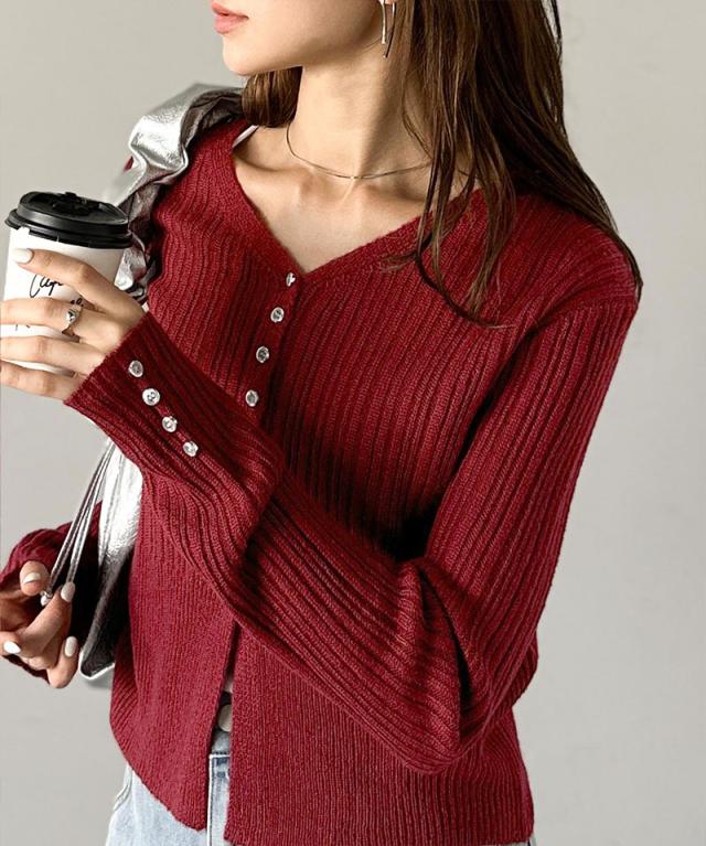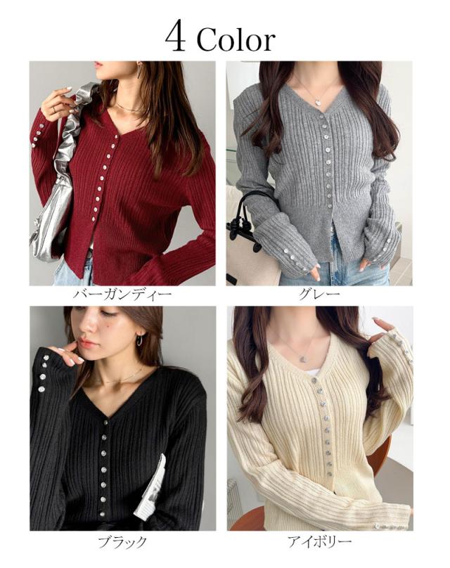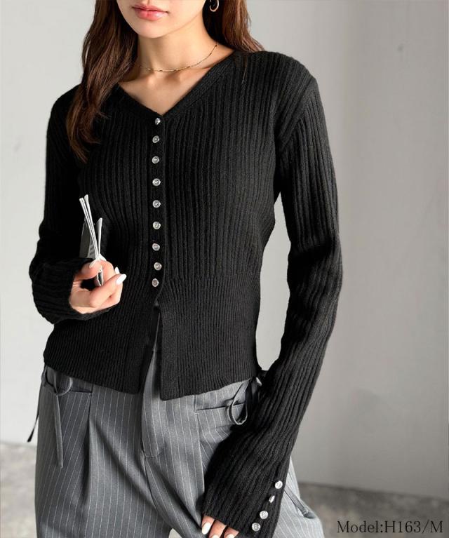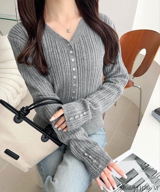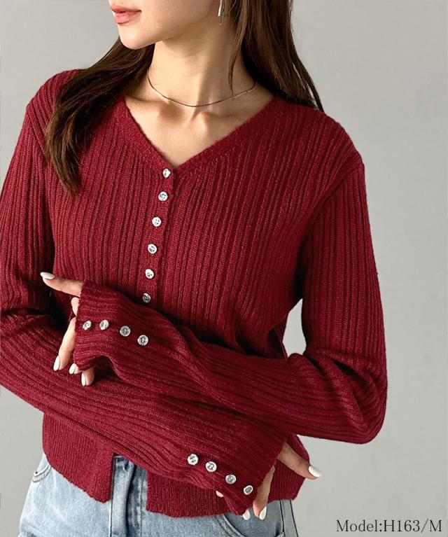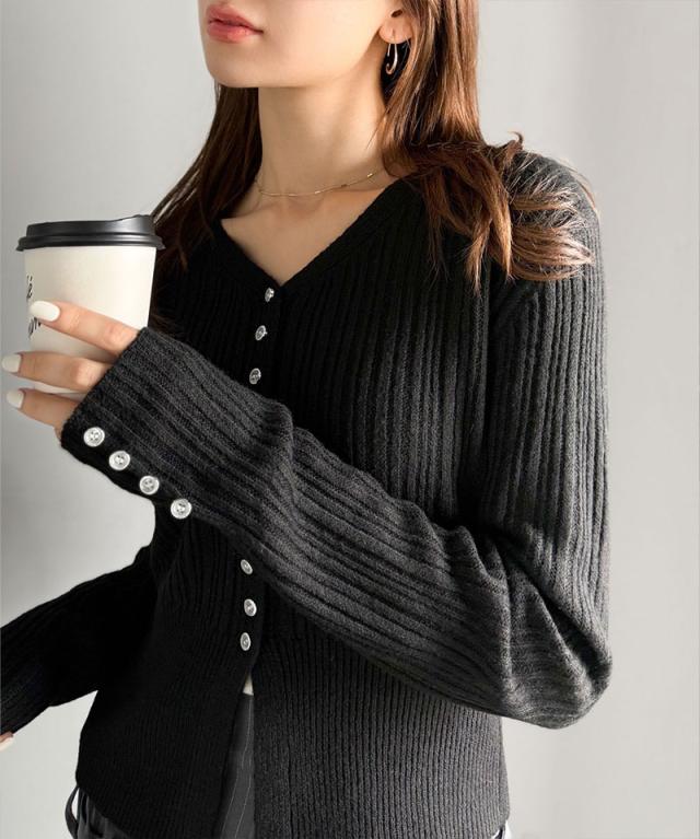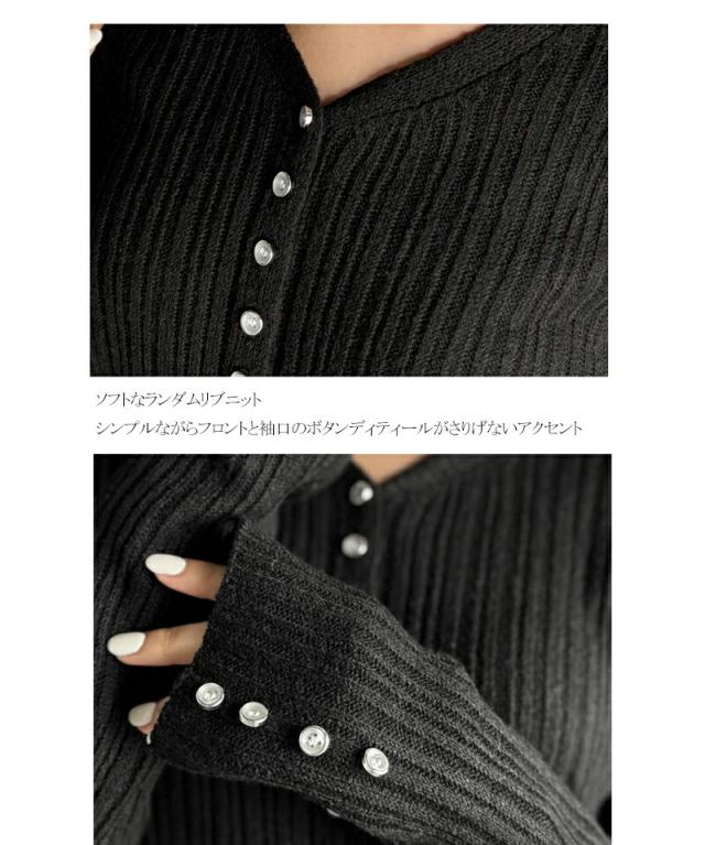 シンプルながらフロントと袖口のボタンディティールがさりげないアクセントになっているリブニット。