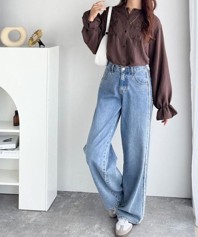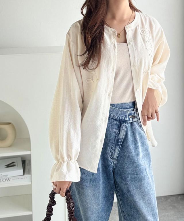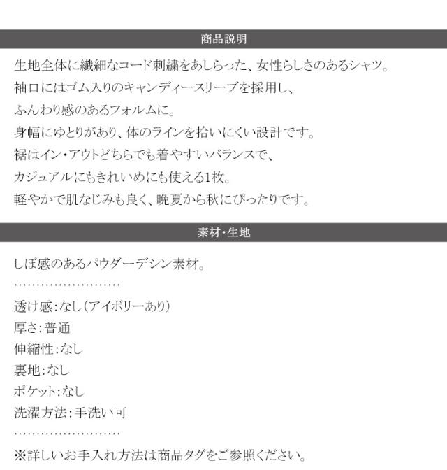 生地全体に繊細なコード刺繍をあしらった、女性らしさのあるシャツ。