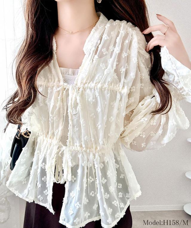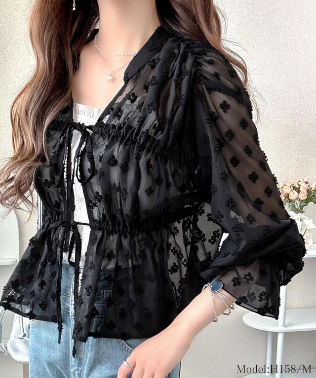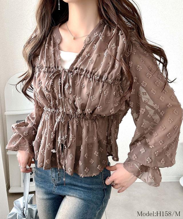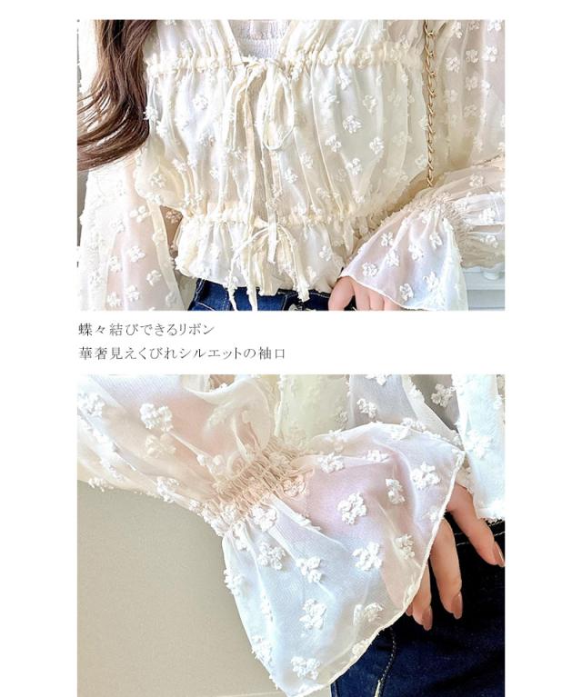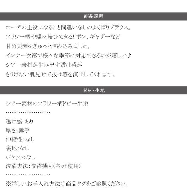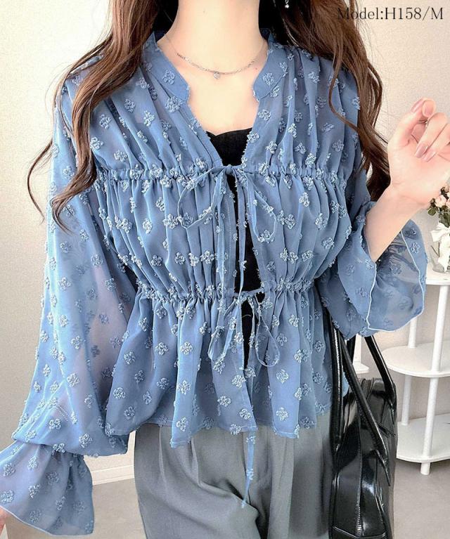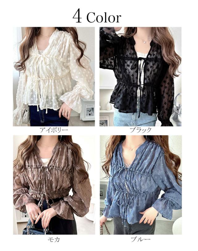 クラシカルエルフ冬新作 mily bilet トップス ブラウス レディース 花柄 シフォン カーデ 大人 透け感 フラワー柄 シアー素材 リボン ギャザー かわいい ドビーブラウス 羽織り 蝶々結び 甘め きれいめ お出かけ お呼ばれ 大きいサイズ 2025aw mi1019105