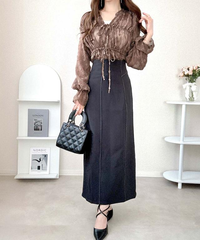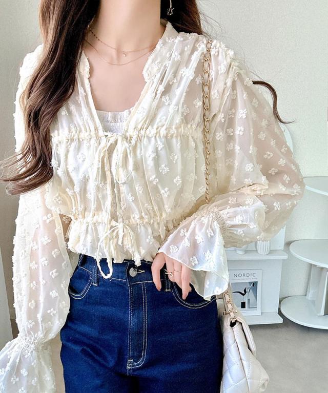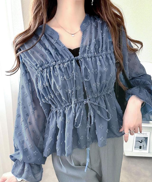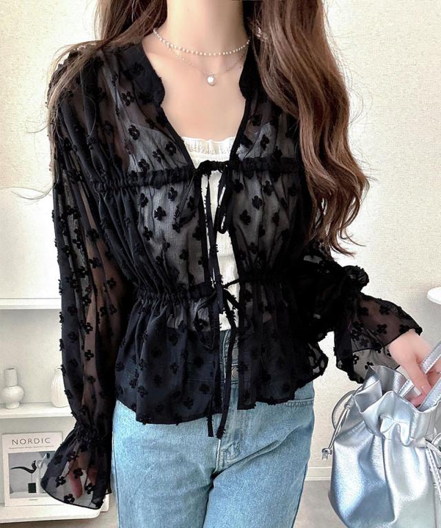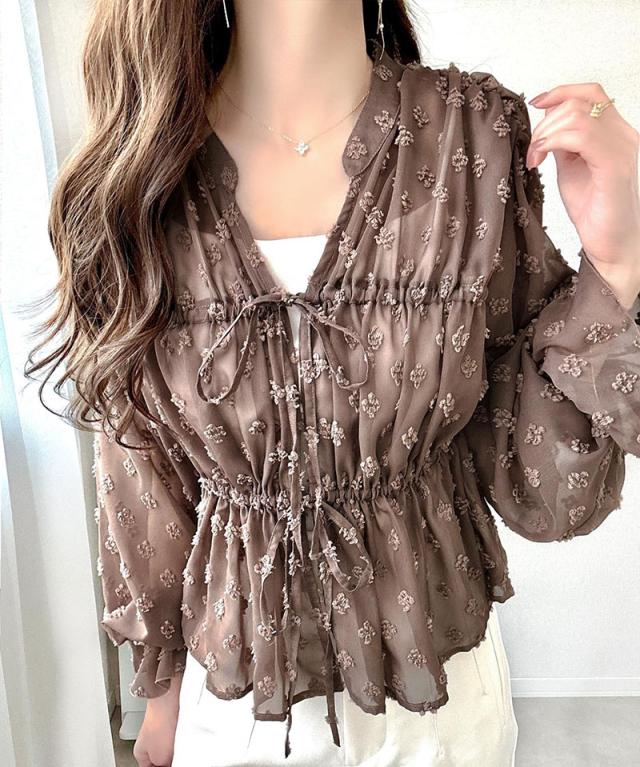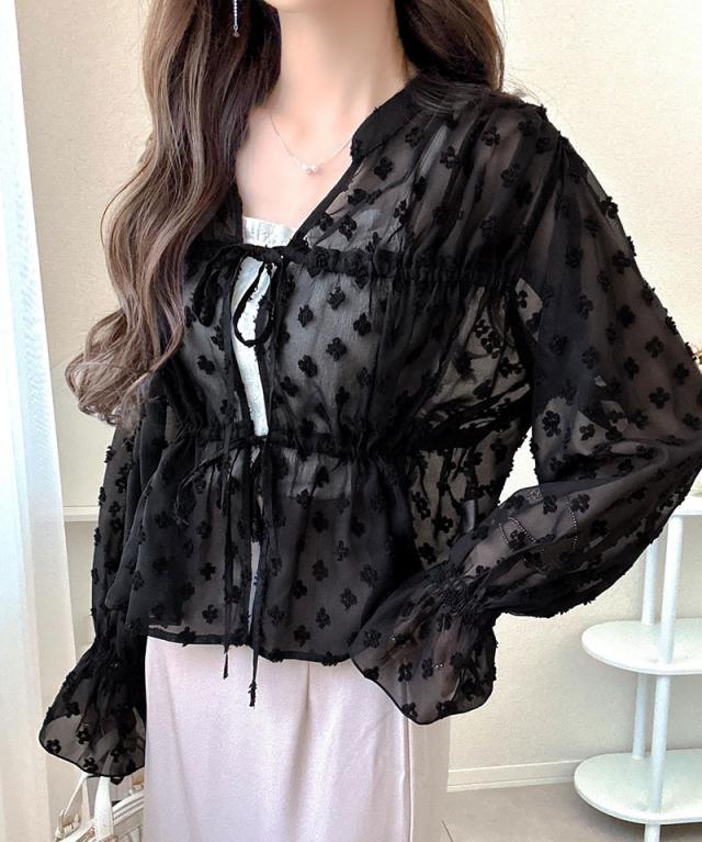 クラシカルエルフ冬新作 mily bilet トップス ブラウス レディース 花柄 シフォン カーデ 大人 透け感 フラワー柄 シアー素材 リボン ギャザー かわいい ドビーブラウス 羽織り 蝶々結び 甘め きれいめ お出かけ お呼ばれ 大きいサイズ 2025aw mi1019105