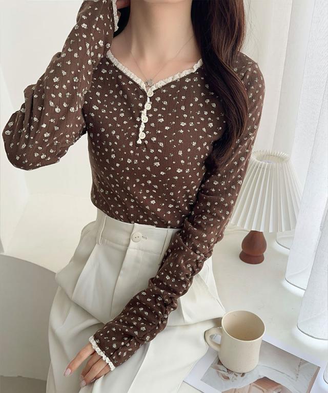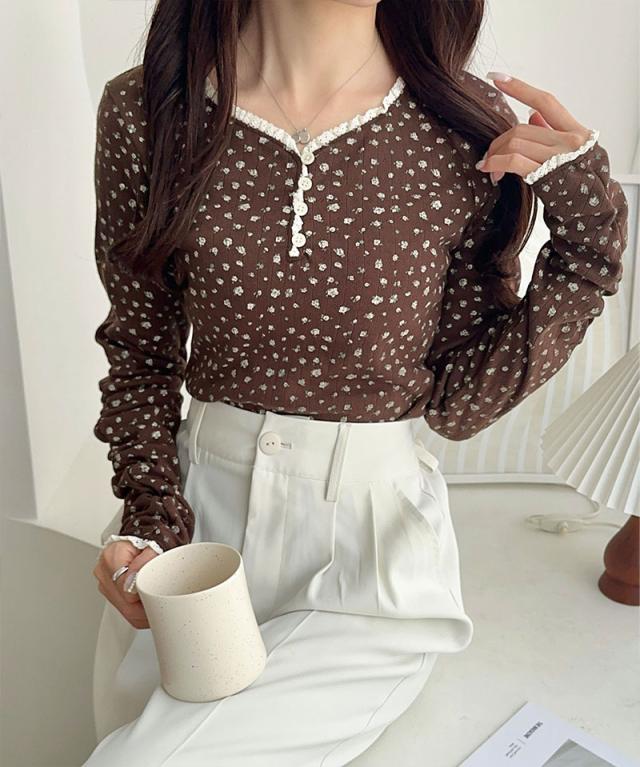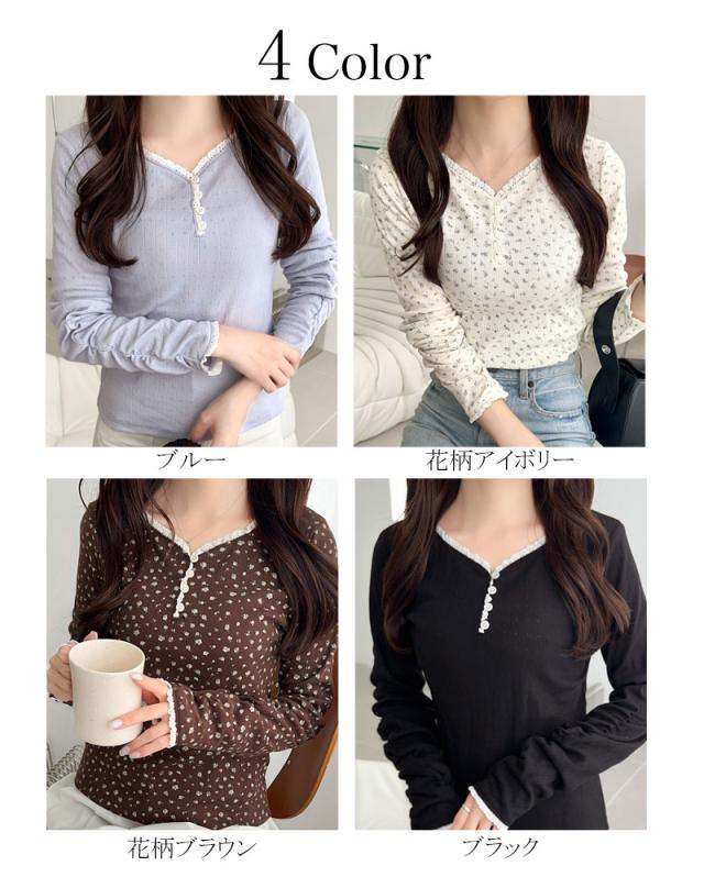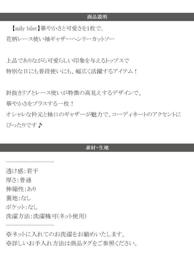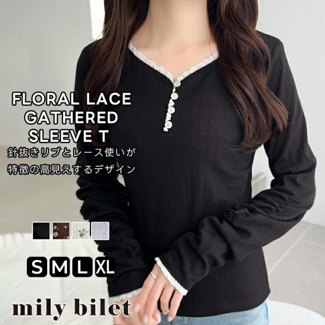 クラシカルエルフ冬新作 mily bilet トップス Tシャツ レディース 華やか 花柄 レース 使い 袖 ギャザー ヘンリー カットソー 長袖 大きいサイズ 2025aw mi1019106