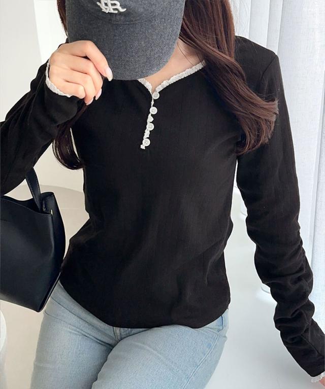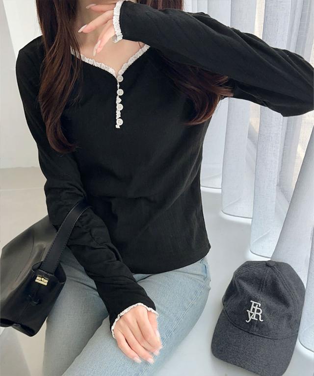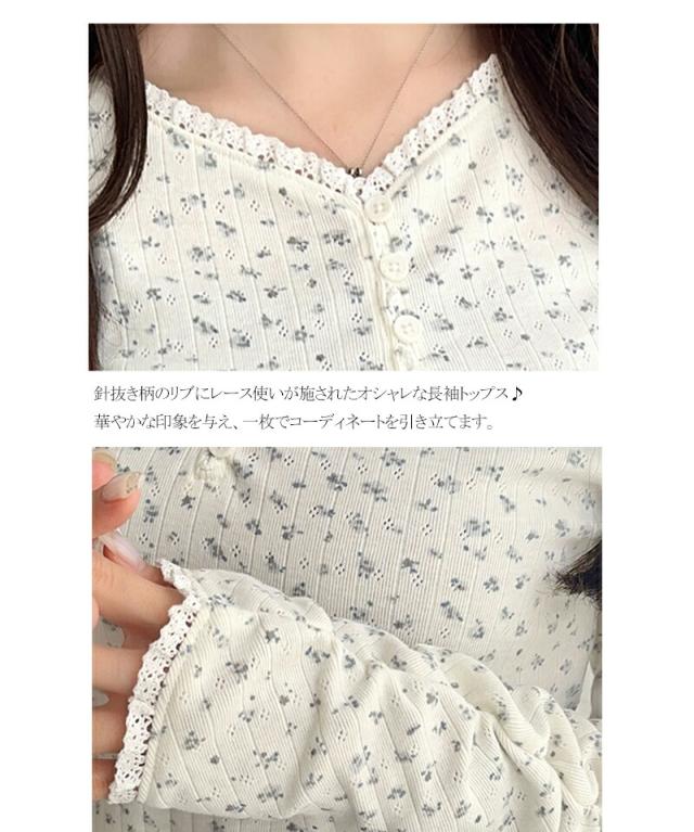 針抜き柄のリブにレース使いが施されたオシャレな長袖トップス♪