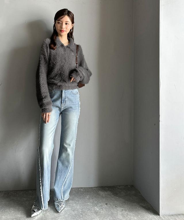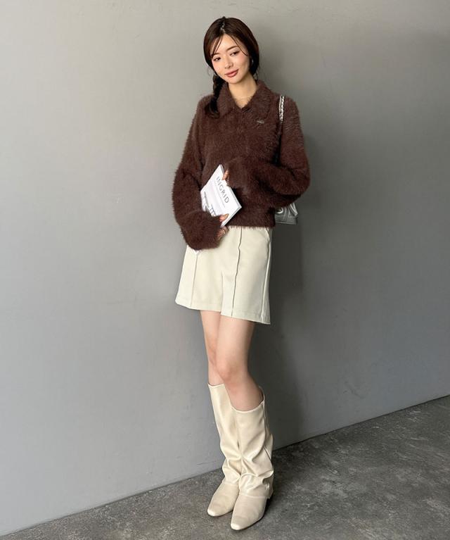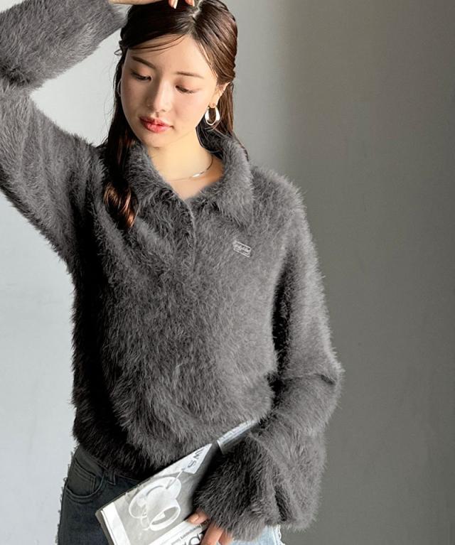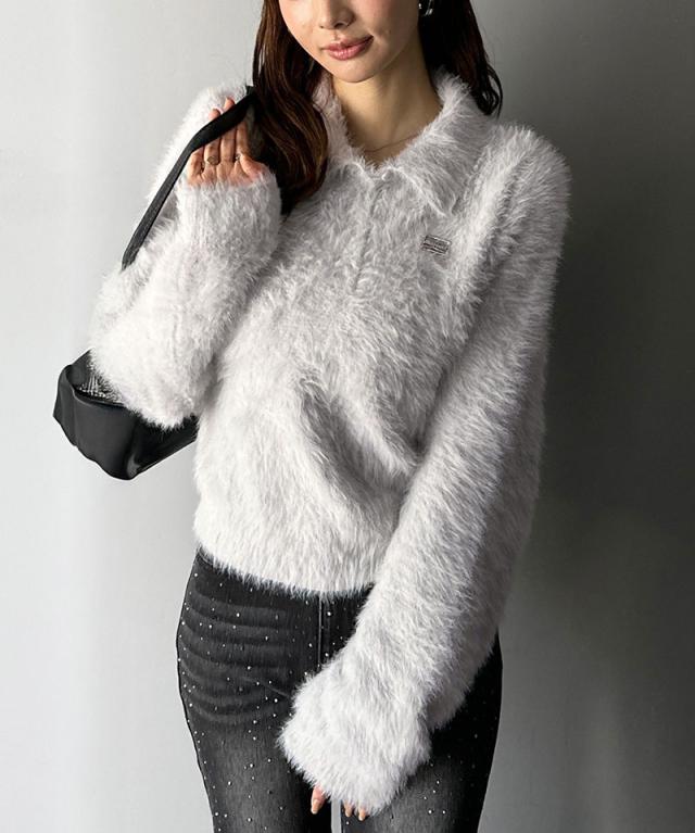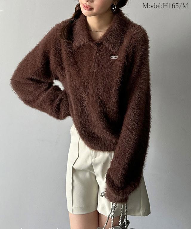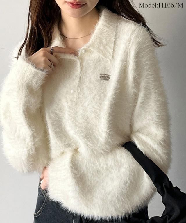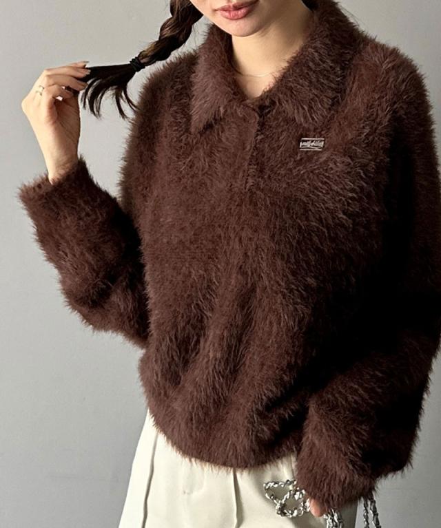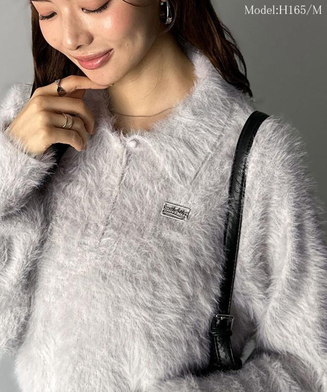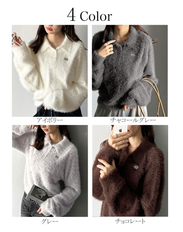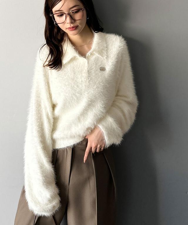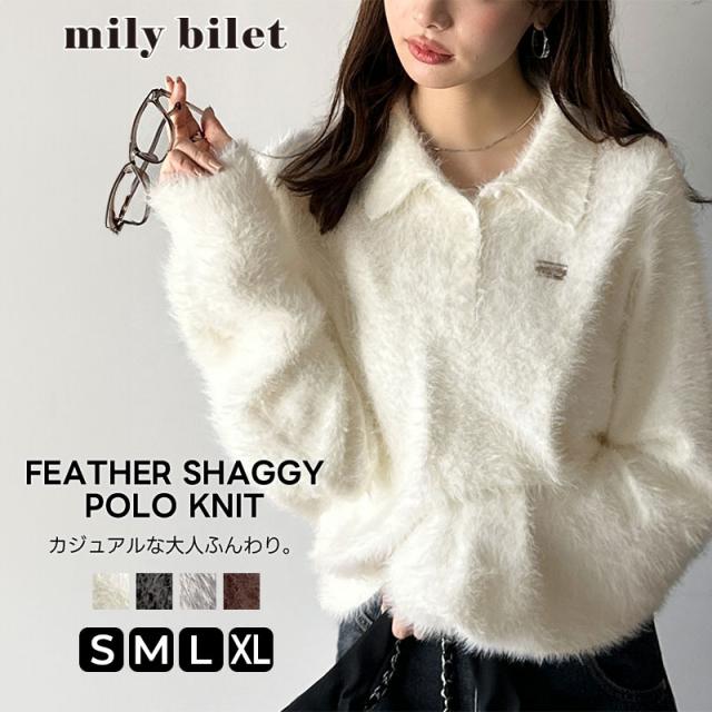 クラシカルエルフ冬新作 mily bilet トップス ニット レディース カジュアル ふんわり フェザー シャギー ポロニット 長袖 上品 大活躍 メタルプレート クロップド丈 シンプル ふわふわ ポロ衿 ボリューム袖 シンプル ゆとり 大きいサイズ 2025aw mi1029134