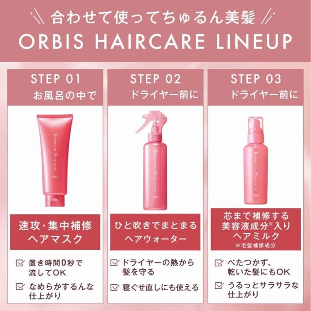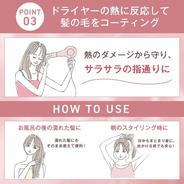 パサつき、広がり、枝毛、ツヤ不足…。そんな髪のお悩みを解決する、洗い流さないタイプのトリートメント。ドライヤーの熱を味方に、擬似キューティクルを作り出すことで、サラサラつるんの指通りを実現します。高保水ミルク(*1)が、うるおいを逃がさないように髪表面をコート。ダメージを受けがちな髪へ、内外からのしっかりケアで、うるおい健康美髪をずっとキープします。