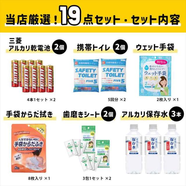 ![]() 「まだ大丈夫」だと思っていませんか?30年以内の超巨大地震発生確率は80%と言われています。 水や電気などのライフラインが止まったら、避難所生活になったら……お家の備えは十分ですか?でも何から準備すればいいかわからない、そんなあなたにオススメのセットです!![]() 『もしも』にこれだけは備えたい!当店オリジナルの防災36点セット 防災グッズシリーズ『モシモニソナエル』の15点セットに加え、避難生活にあると便利な消耗品を中心とした当店厳選の防災グッズを19点プラス。 はじめての防災にもぴったりな、当店オリジナルセットです。 心強い4機能付き!マルチ電源のラジオランタン。ライトは満充電で5時間使用でき、3段階の調光機能付き。情報収集に欠かせないFMラジオはワイドFM対応で9時間の使用が可能。緊急時に居場所を知らせられるサイレンはスイッチ一つで切り替えできます。バッテリーはUSBケーブルで他機器を充電でき、いざというときも安心です。 太陽光ソーラーパネル、手回し、USB、乾電池の4つの電源でバッテリーに充電が可能。どんな場面でも電源が途切れず安心です。 停電時も安心!単三乾電池4本で使用できるライト付きバッテリー。![]() ![]() ![]() ![]() ![]() Details 【防災36点セット】 ブランド名 モシモニソナエル セット内容 <モシモニソナエル15点セット+モバイルバッテリー・ラジオランタン> ●持ち出し袋 ×1 ●給水バッグ 3L ×1 ●LEDライト ×1 ●ホイッスル ×1 ●アルミシート(120×80cm) ×1 ●三角巾 ×1 ●グローブ ×1 ●圧縮タオル(24×40cm) ×1 ●ウエットティッシュ ×1 ●ポリ袋(3枚) ×1 ●ウェットティッシュ ×1 ●ポーチ ×1 ●カット綿(6枚) ×1 ●綿棒(10本) ×1 ●不織布マスク(3枚) ×1 ●防災ブック ×1 ●モシモニソナエル 乾電池式モバイルバッテリー ×1 ●モシモニソナエル マルチ電源ラジオランタン ×1 <当店厳選グッズ19点> ●三菱アルカリ乾電池(単三) 4本 ×2 ●携帯トイレ(5回分)×2 ●手袋シャンプー(5枚入り)×1 ●手袋からだふき(8枚入り)×1 ●歯磨きシート(3包)×2 ●アルカリ保存水 ×3 ●エアークッション ×1 ●給水バッグ 5L×1 ●ブルーシート×1 ●使い捨てカイロ×2 ●救急セット×1 ●水に流せるポケットティッシュ×2 ご注意 ※バッテリー用のUSBケーブルは付属しておりません。 ※表記サイズより、多少の誤差があることがございます。 ※商品の画像はできる限り実物に近づけるよう配慮しておりますが、お使いのモニターやご覧になる環境によりましてはカラーの見え方に差が出る場合がございます。ご了承くださいませ。 関連キーワード 防災セット 1人用 モシモニソナエル 防災15点セット 避難セット 防災グッズ セット 中身だけ 災害対策グッズ 避難用品 非常用持ち出し袋 防災士監修 持ち運び 保存水 備蓄 長期保存 7年間 モバイルバッテリー 乾電池式 モバブ 充電器 トイレ ライト ホイッスル LEDランタン ラジオ 電池式 乾電池 手回し ソーラー FMラジオ ワイドFM対応 サイレン 防犯ブザー コンパクト 収納 災害 地震 水害 台風 停電 対策 備える 非常用持出袋 家庭用防災セット 備蓄セット 36点セット ナップサック 大人 子供 男性 女性 初心者 厳選 入門 手軽 高齢者 施設 車内 学校 一人暮らし オフィス 自治体 常備品 家族 両親 ギフト プレゼント 小学校 中学校 高校 大学 保育園 保育所 幼稚園 息子 娘 孫 レディース メンズ 父 母 おかあさん おとうさん パパ ママ シニア おじいちゃん おばあちゃん お爺ちゃん お婆ちゃん 祖父 祖母 じいじ ばあば バースデープレゼント 誕生日 敬老の日 帰省 新生活 引っ越し祝い プチギフト ミニギフト 贈り物 粗品 景品 イベント 母の日 父の日 クリスマス クリスマスプレゼント 防災リュック 持ち出し袋 給水バッグ 3L 5L LEDライト 懐中電灯 アルミシート グローブ 軍手 携帯簡易トイレ 圧縮タオル ポリ袋 ポーチ 救急セット 絆創膏 綿棒 使い切りカイロ 笛 三角巾 ポケットティッシュ 防災ブック チェックリスト 連絡先リスト 三菱アルカリ乾電池 ウェットタオル ウェットティッシュ 歯磨きシート 衛生シート 体拭き からだふき 水のいらないシャンプー ドライシャンプー 手袋シャンプー エアークッション 水に流せるティッシュ マスク アルカリ保存水 ブルーシート 目隠し 分散備蓄 配布用 | |||||||||||||||